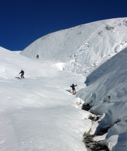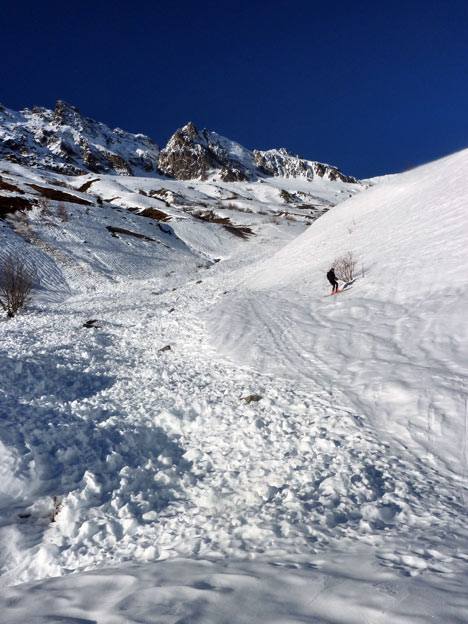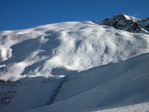 neige glacée de haut en bas avec de profondes rigoles. quelques micro-zones en fond de talweg avec un peu de poudre rapportée. Nombreuses avalanches en tout versants, départs en plaque et souvent au terrain.