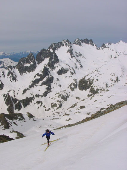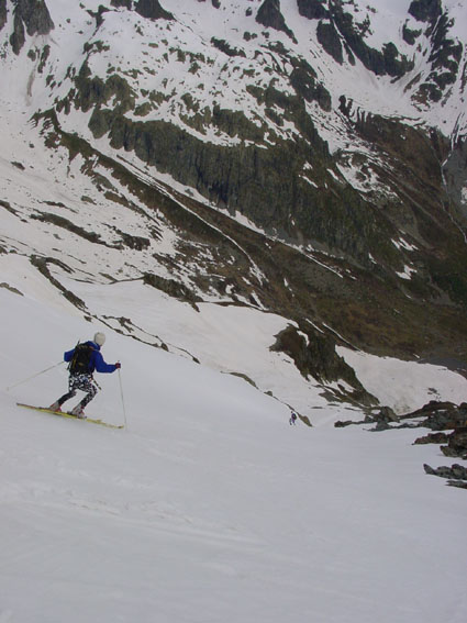 Boucle. Sambuis par F1, puis descente par E19 (excellente, pas de crochet à faire dans l'étroiture 100 m sous le sommet), Au pied de la face, à partir de 2350 m, traverser à gauche et atteindre la combe à 2150 m. Remonter en direction de Brabant, dépasser nettement la combe de E18, puis vers 2400 tourner à gauche et attaquer vers 2500 une pente de neige raide (goulottes très profondes= 2m) : la pente de 50° sur 100 m atteint 55° sur les 150 m suivants. Tirer à droite : la neige est suivie par un dièdre de rochers pourris : l'escalader sur 100 m (2 pas de IV). Traverser le sommet du bec d'Arguille et descendre sur la droite dans un petit couloir rocheux (facile) : on chausse les skis dans une langue de neige vers 2850 m. Descendre toute la face sud-sud-est : au milieu il faut tirer à droite, puis s'engager en oblique à gauche dans une vire enneigée (45° sur 100 m). La suite est facile : on skie jusqu'au-dessus de la combe Madame à 2200 m, on remet les peaux pour rejoindre le col de la Croix par C19 et de là on rejoint le Glandon par F3. D+1800. 4.3/D/E3. NB : la montée décrite sur l'Arguille est située entre la face est et le couloir nord : elle n'est pas obligatoire même dans cette boucle. La face est est nettement plus facile : arrivée en peaux (35-40°) juste sous les rochers puis une petite cheminée (avec un pas de III) et enfin l'arête (passages de II) jusqu'au sommet, donc PD (au lieu de D)