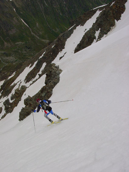 Boucle de "firn ski" (ski de névé pour les Autrichiens qui en raffolent) de toute beauté. Conditions de ski d'été impeccables grâce au faible regel de la nuit précédente et au temps couvert toute la journée.