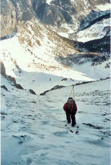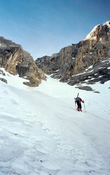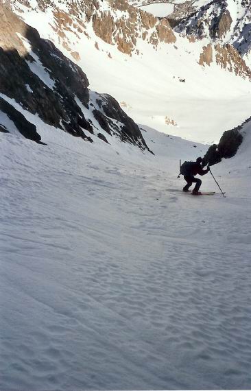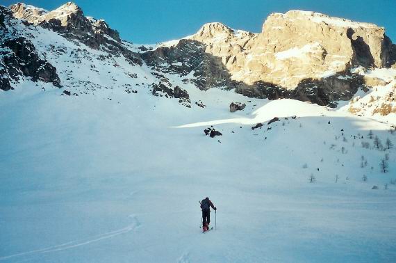 Les conditions moyennes de la face nord est de la Saume (passages rocheux dans la barre et entonnoir sommitale très soufflé : voir photos 2 et 3) nous ont fait préférer un retour par le couloir nord est de la mamelle en biens meilleures conditions (photo 5). Ca donne un très beau tour de la Saume en passant par le sommet et en restant au plus prêt de celui-ci. Très belle ambiance toujours alpine, très bonne neige versant nord abrité.