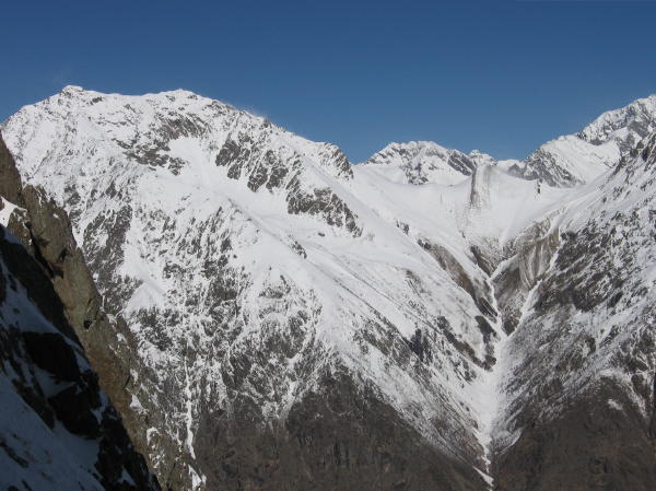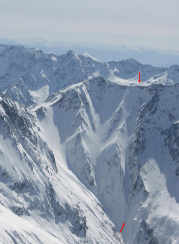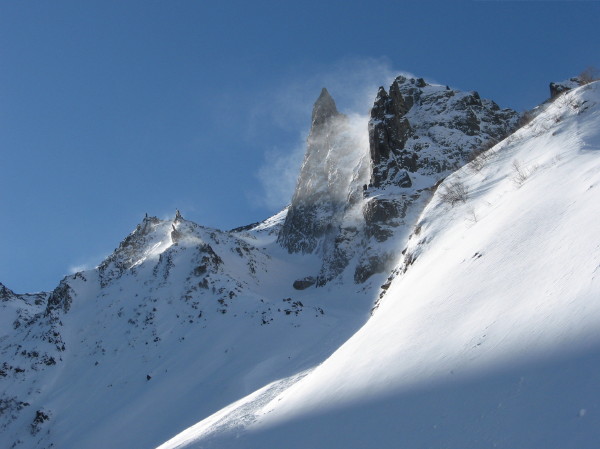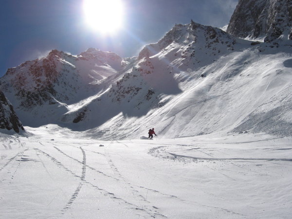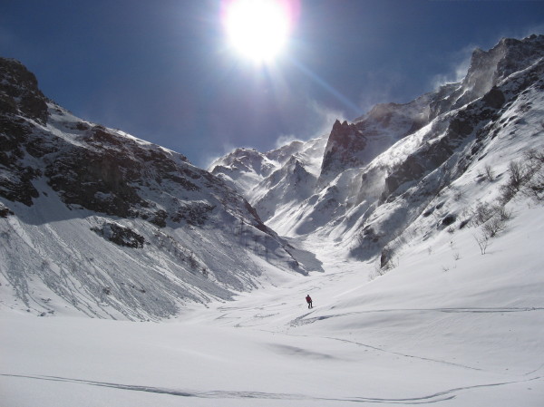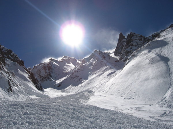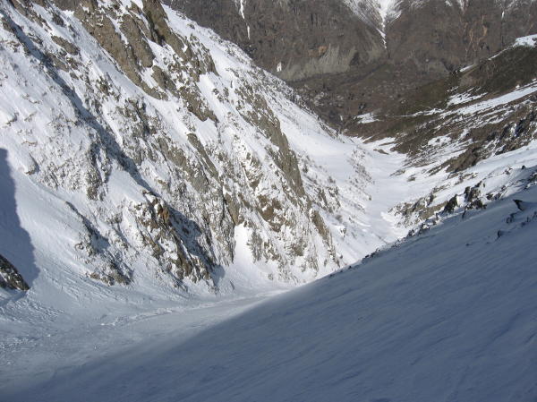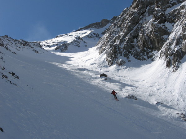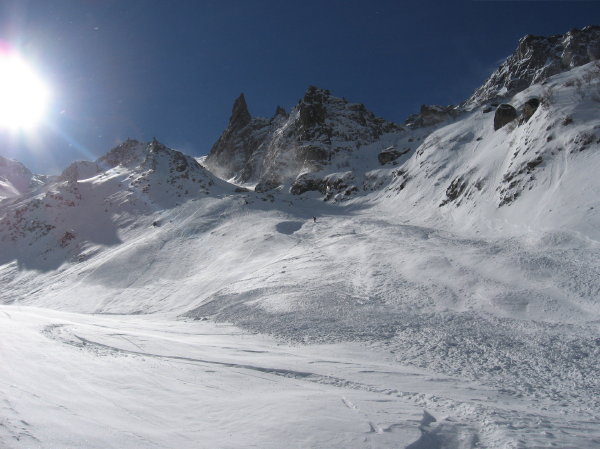 Comme les conditions peuvent changer d'un jour sur l'autre! Envolée la belle poudre (au sens propre du terme)! But 200m sous la sortie après avoir évité de justesse une bonne grosse purge des familles due à une petite rupture de plaque formée et déclenchée quasi instantanément sous l'action des grosses rafales de vent. Quand on a vu le résultat au pied du couloir (tout est descendu en aérosol) on a réalisé qu'on avait eu de la chance d'être assez haut dans le couloir pour pouvoir l'éviter. Sinon vallon magnifique et ski extra sauf à peine 100m croutés infâmes. On reviendra finir le travail!