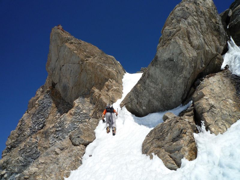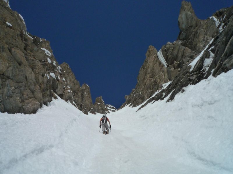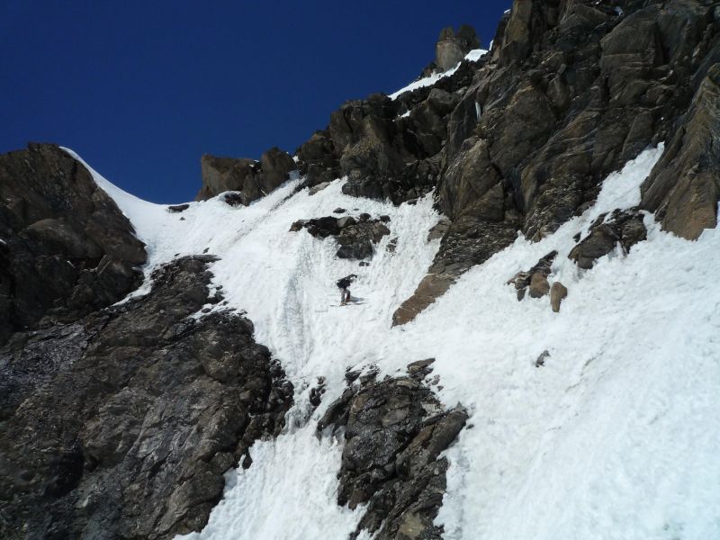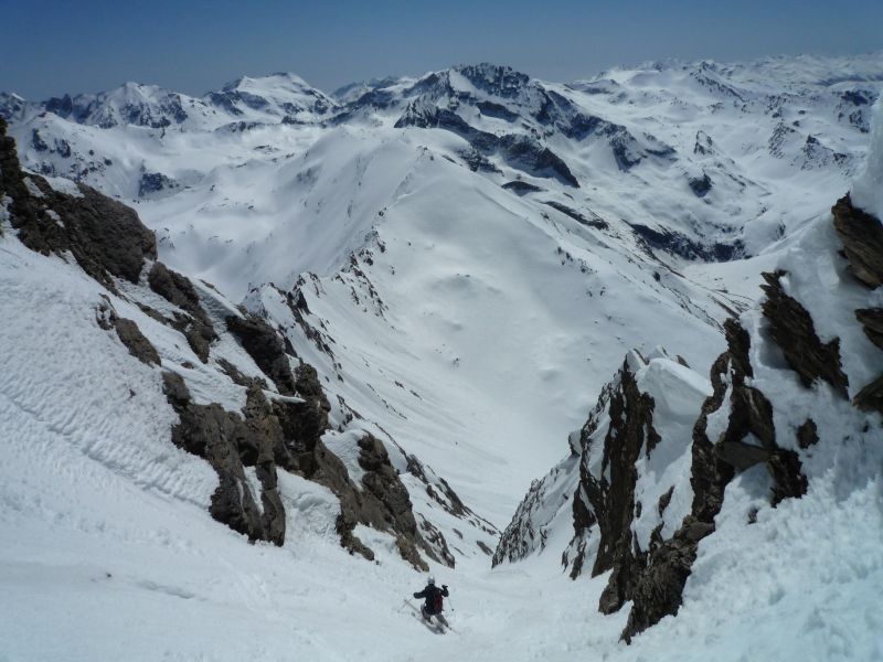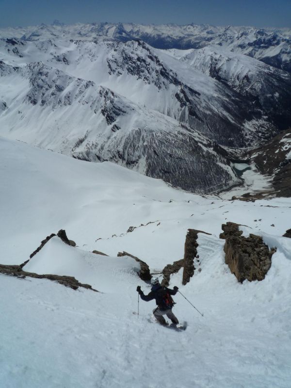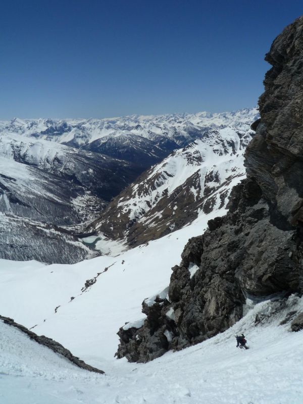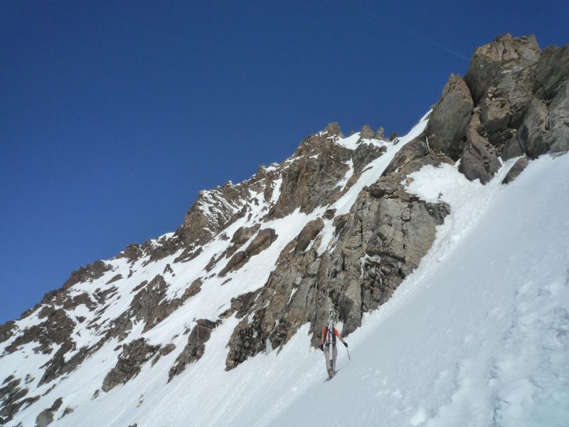 Observée en mars depuis les vallons de Valfredda et de la "Balma", il était temps d'aller visiter cette face sauvage. Avec notre option du jour à la montée, une approche un peu pénible dans des pentes sud déneigées garde la face haut perchée. Le couloir oblique en est le réel attrait, car le plus skiant. En remontant à Pierre-Minieu après la face sud, la skiabilité augmente dans des belles pentes, qui plus est en moquette...