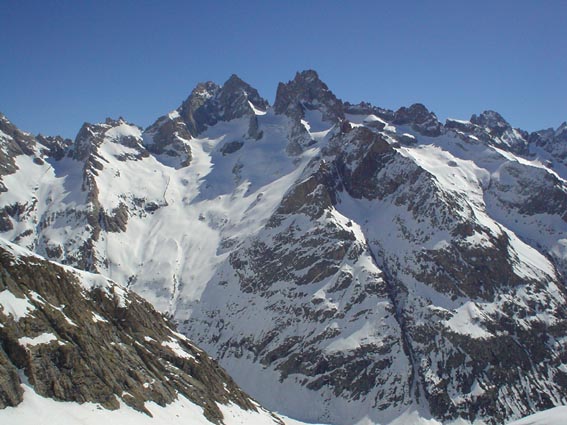 On chausse les ski, apres avoir traverse le torrent de Bonne Pierre. neige transfo jusqu'a 2500m, puis de la fraÓche (20 cm) sur une bonne sous couche dure, plus ou moins ventee assez facile a skier. Nous nous sommes arretes a 3200 m, la derniere pente est bien plaquee, environ 40 a 60 cm de fraiche compacte accumulee par le vent. D+: 1500 m        difficulte: 3.3        horaire: 4h
