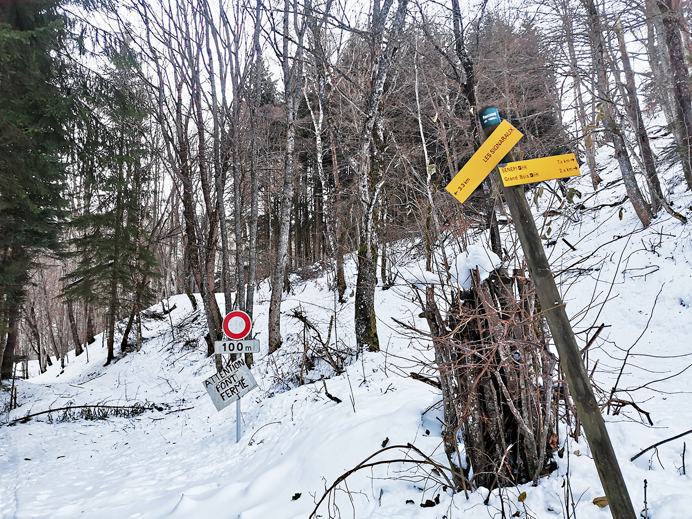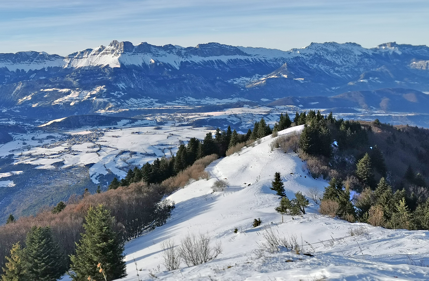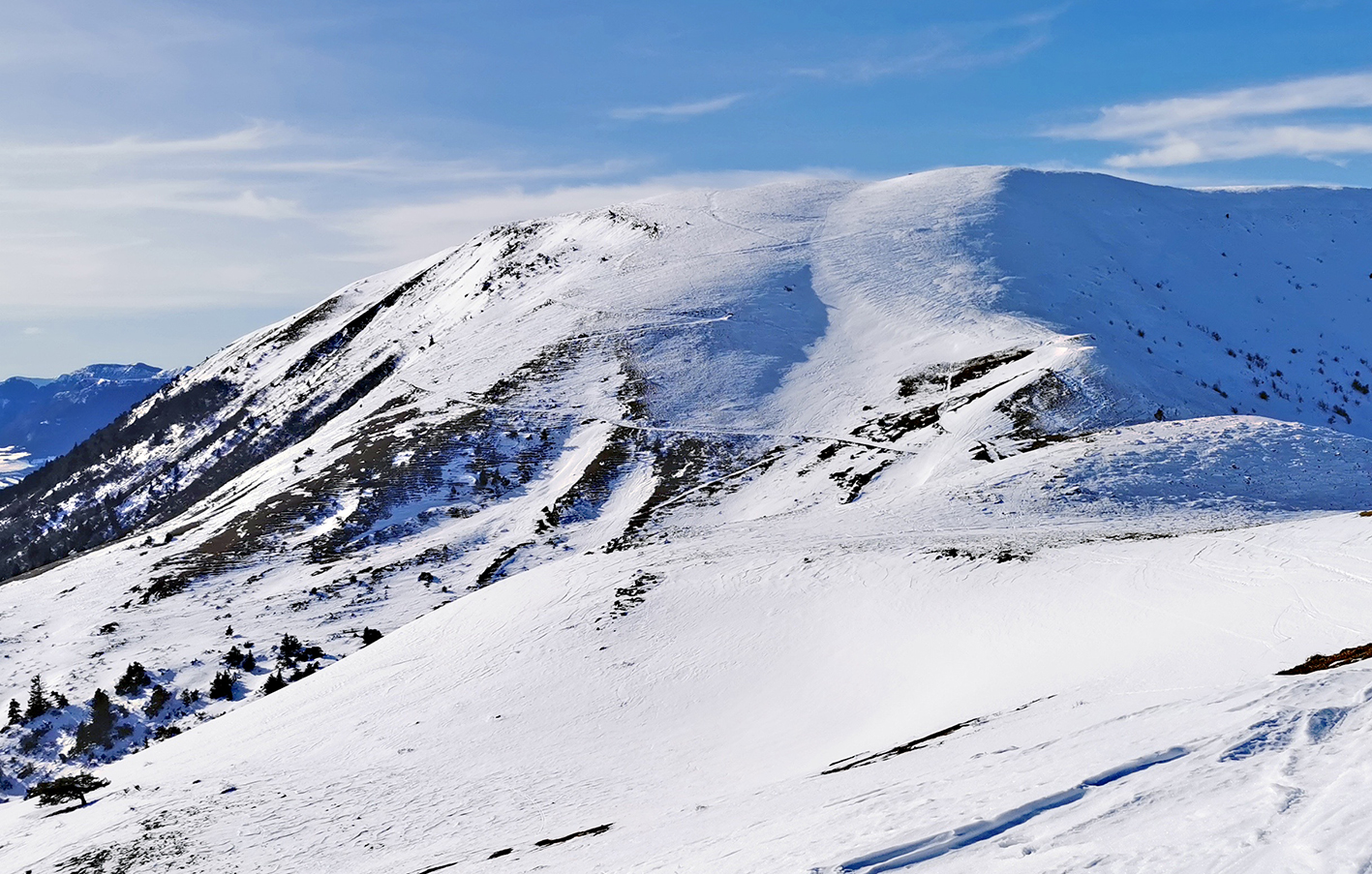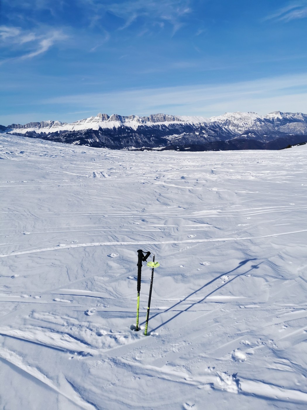Pour changer du confinement poudreux Chartreuse-Vercors (nord). Après avoir renoncé au départ de la Peyrouse depuis la Ville de Monteynard (A3 trop peu enneigé)je me reporte sur les Signaraux où les pistes d'alpin sont préparées et celles de ski de fond en excellente condition. Le versant est de l'Horizon est en neige de printemps quasiment portante même à la montée. Pour la descente du bois d'Arve il faut normalement deux fois plus de neige qu'aujourd'hui. Dans ces conditions la neige lourde permet de sauver la situation. Déconseillé néanmoins de suivre cette trace dans les conditions actuelles.
