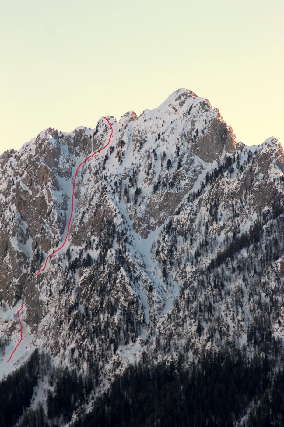 Détail du grand couloir : depuis le sommet central, une pente soutenue en traversée vers l'E mène au couloir moins raide. A la fin du couloir une traversée expo vers l'E permet de rejoindre un arbre duquel un rappel de 50m nous pose dans le cône.