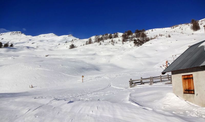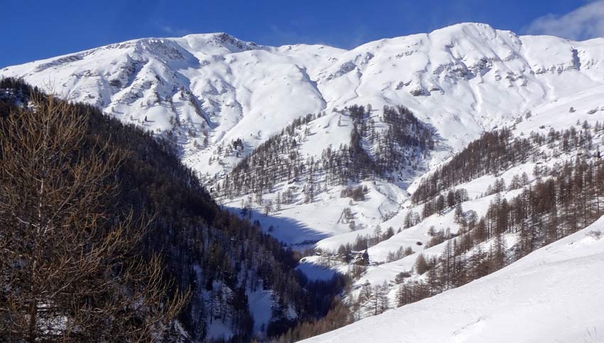 Cette fois encore le Queyras a été en marge des chutes de neige d'ouest. Le dernier épisode à rajouté une dizaine de cm sur des couches minces inconsistantes ...quand elles ont survécu. Au dessus de 2000 le vent a intégralement remanié le manteau peu épais, dégarnissant des croupes mais plaquant un peu partout sur des épaisseurs conséquentes sous les crêtes du Petit Rochebrune ou de Crousette (une hauteur de bâton vers 2400 sous la crête). Pour le Serre d'Aigle, le relief de petites combes et de croupes fait alterner poudreuse, bandes durcies et congères. Le ski y est sûr et agréable en faisant un peu attention