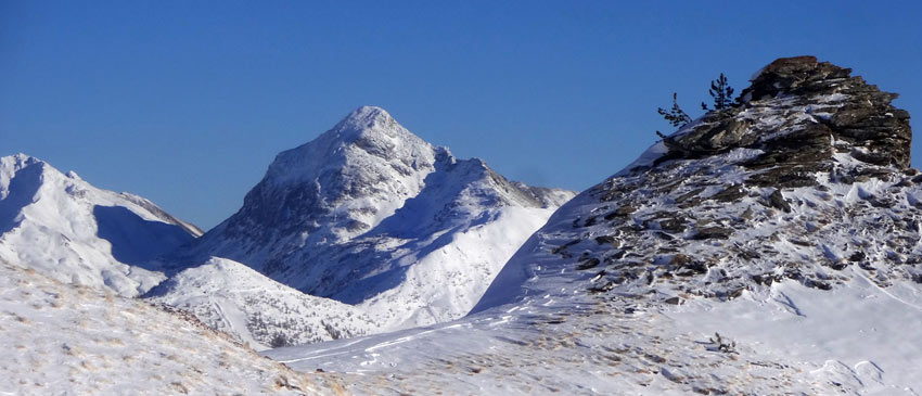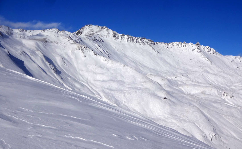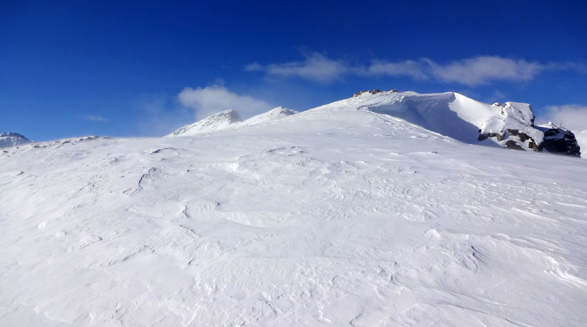 Variante de D3 pour éviter la pente des Eygliers non skiable. Monter la piste du Lombard intégralement skiable jusqu'à la Caramagne. Monter par des petits vallonnements et des croupes bien enneigées à la bergerie du Lombard puis aux crêtes, au nord du sommet classique.