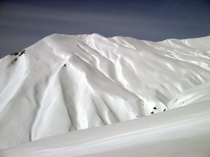 pas de transition entre la neige froide du haut et la neige transformée. pas vu de zone suspecte même sous corniches. pas vu de zones friables. Seules quelques zones de reptation ne se sont peut être pas encore purgées. Risque 3 ? OK si c'est sur une échelle à 6 ou 7 niveaux. Mais il y a toujours un problême avec une échelle à 5 niveaux dont deux sont évidents, voire inutiles : le 1 et le 5. Il n'en reste plus que le plus petit nombre impair possible = 3. Et on se cale sur le 3 pour des choses tellement différentes.