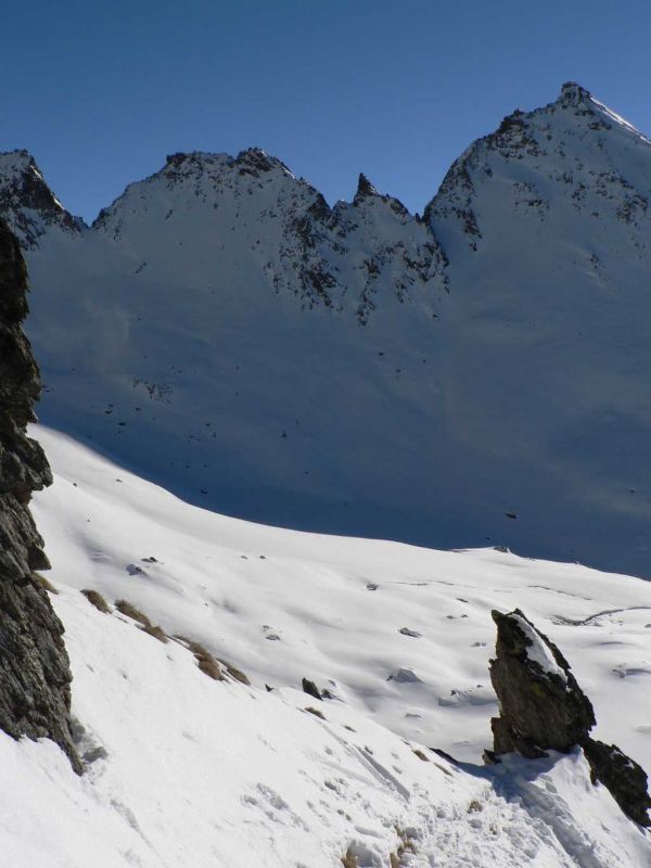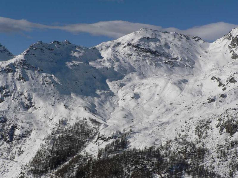 Mondanges, sentier rive droite en amont de la route qui mène au barrage de Beauregard. Vallon di praz londzet, Sigaro (gendarme au pied de l'arête ouest de la becca di Pré d'Amont.