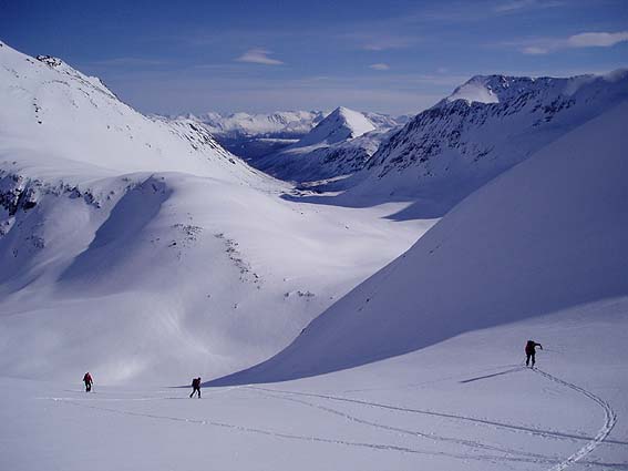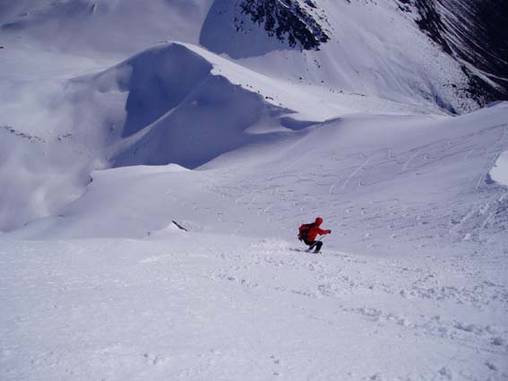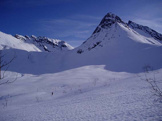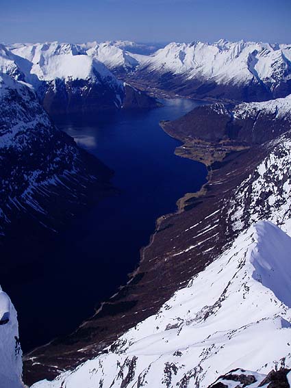 Norvège, massif de Sunmore. montée vallon de de Urkeelva puis arête est. descente directe face nord-est, pass. 45°, 40°/400, ski : 4.2