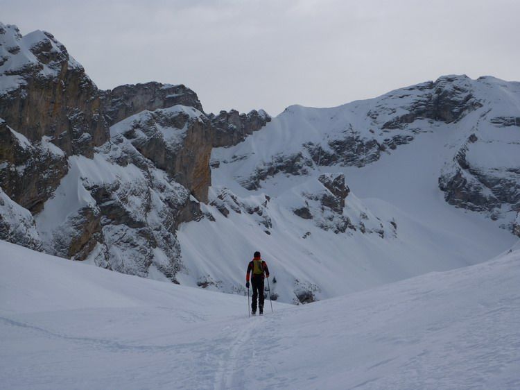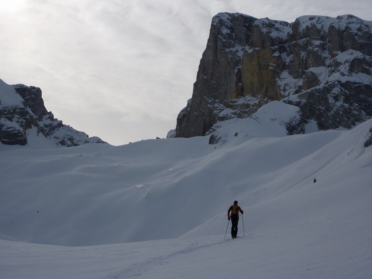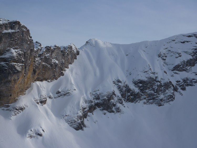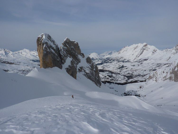 Commencée à l'heure de l'apéro, ce devait être une boucle tranquille, elle le fut au milieu de ces superbes falaises et sous l'œil du pilier Est du Pic de Bure. On l'a aussi agrémentée de 2 beaux petits versants nord. Une belle rampe oblique, un peu exposée, mais en très bonnes conditions, puis ensuite au retour la belle petite face nord de la crête de l'Ane où nous n'avons pas résisté à l'envie de remonter. C'est toujours en super conditions depuis [hier -> http://www.volopress.net/volo/sortie3556.html]