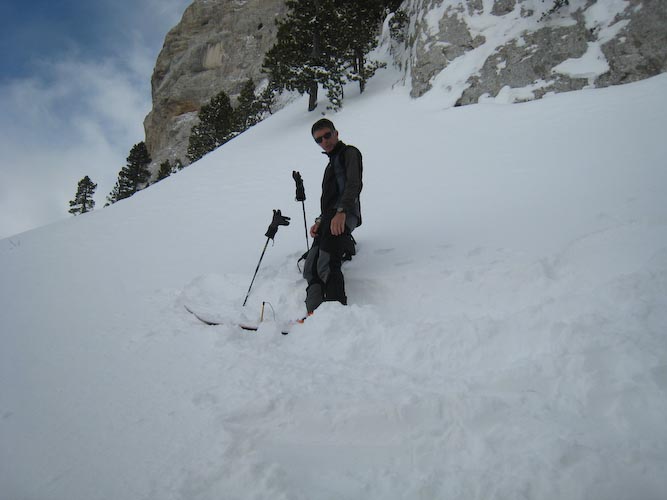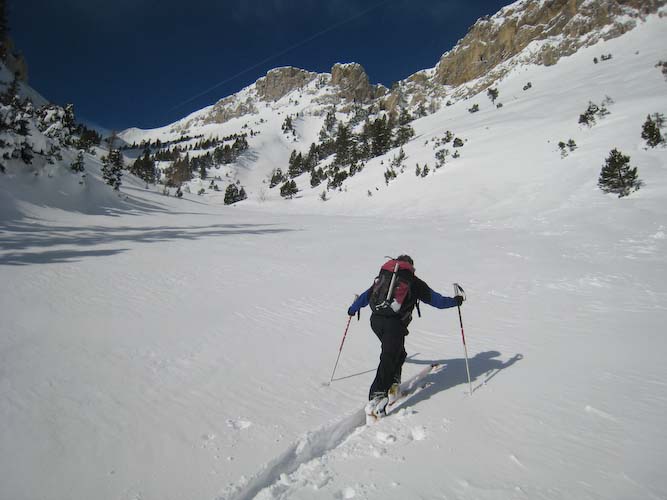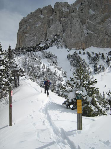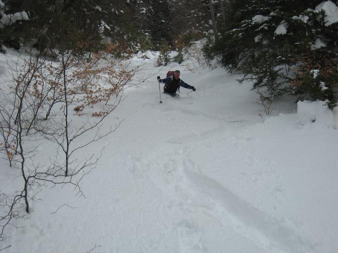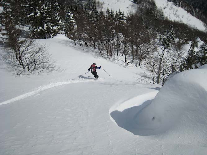 Au dessus de la foret neige soufflée, en dessous à l'ombre neige froide poudreuse, les parties au soleil sont en cours d'humidification. La trace occupe bien l'homme de tete. Des accumulation très importantes.