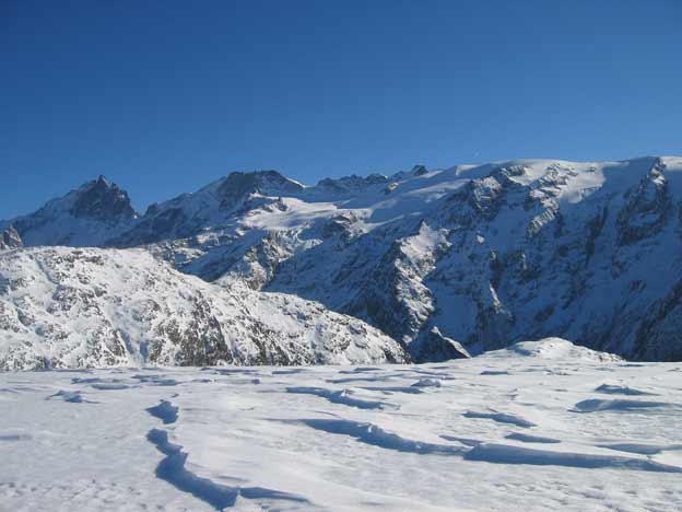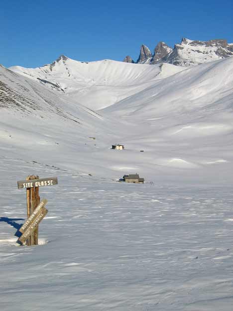 des quantités de neige infimes, mais le vent a aussi pas mal travaillé ici, réussissant à former une congère importante sur le plateau (1m50) malgré le peu de matériau disponible (tout glacé autour).