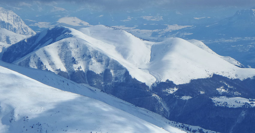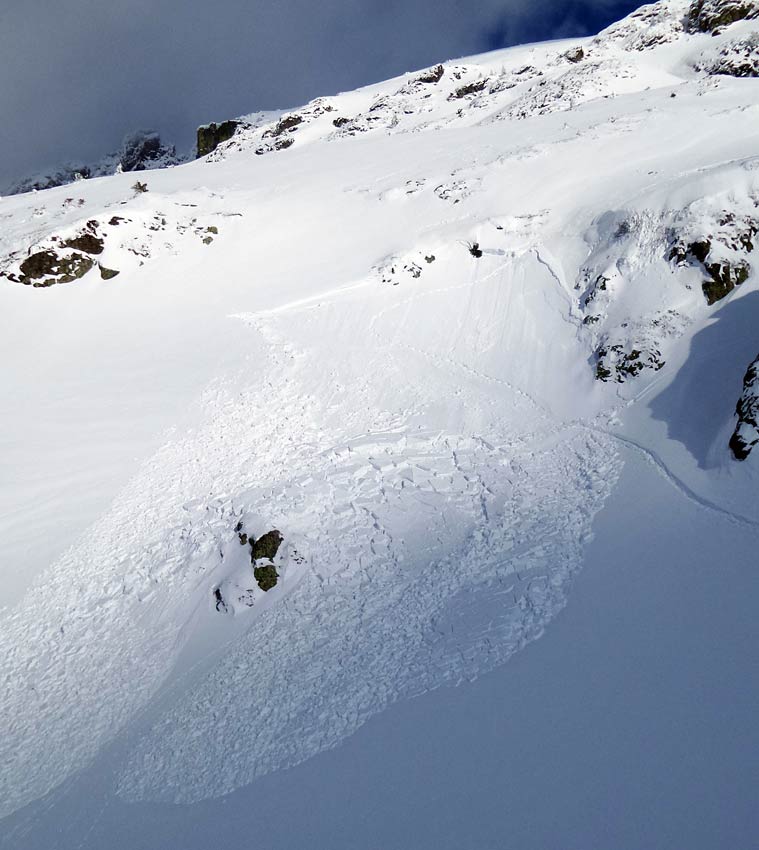 enneigement bon au-dessus de 1750-1800 m voisin de celui des massifs au nord de Grenoble mais beaucoup plus juste en dessous où la sous-couche peut être discontinue. Semble bien tassé mais vu une plaquette de 20 cm déclenchée peut-être accidentellement à 2100 m sur talus raide près des rochers (voir photo), du coup j'ai renoncé au pérollier (A9). Corniche sommitale très grosse au-dessus de la Mer.