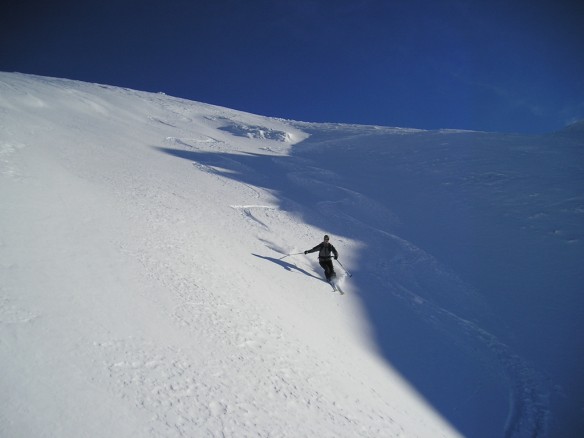 Le vent de NE a beaucoup soufflé en altitude >2000: neige irréulière mais ski agréable toutefois. Beaucoup de petites plaques de neige frittées facilement identifiable à l'?il mais avec une accroche limite avec la sous couche (2 skieurs nous précédant ont en déclenché une à la descente d'un court ressaut raide). Dans le petit couloir de descente: neige bien plaquée au centre, plus légère sur les rives.+ Sinon pas mal de touchettes sans gravité en raison des irrégularités dues au vent. Dans la forêt la neige est légère et repose sur une sous couche bien ferme qui nous a permis de skier quasi jusqu'à la voiture: déchaussage sur 50m linéaires