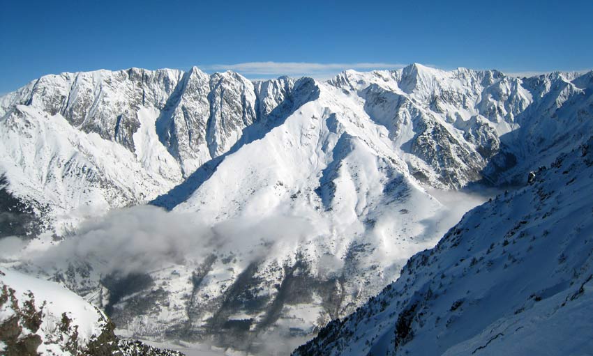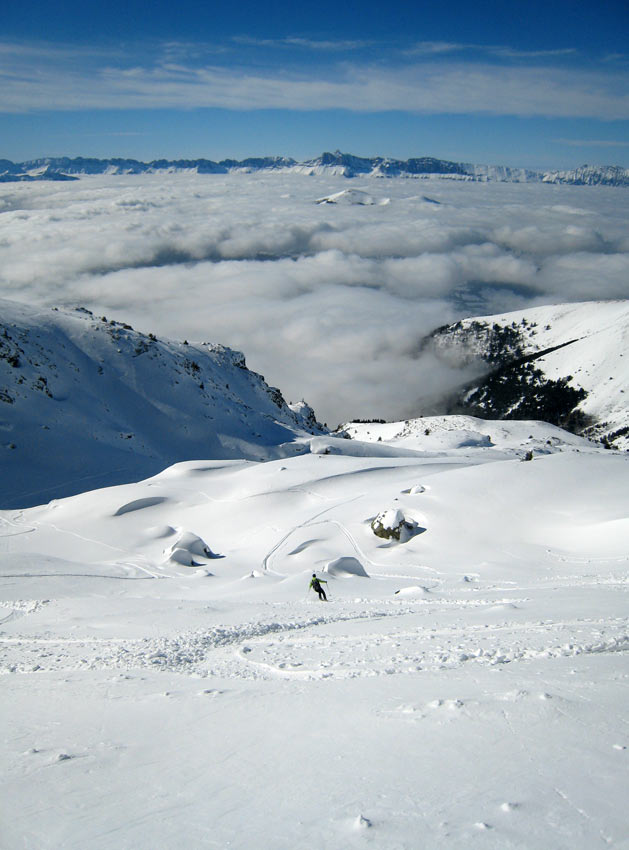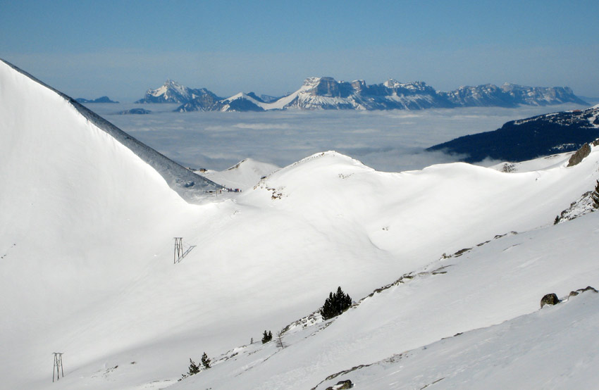 La chute du week-end (en moyenne 20 cm) repose sur une sous-couche regelée mais granuleuse et rarement glacée. La liaison semble assez bonne. La couche meuble ne glisse sur le fond dur qu'au-dessus de 40°. Ici aussi le vent a soufflé avec une composante Est ce qui explique le bon remplissage des versants Ouest.