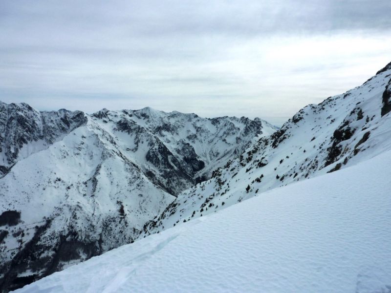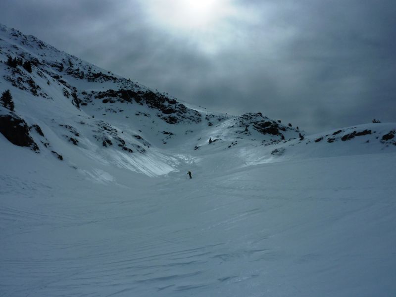 Mauvaise pioche ce jour. Le grand beau doux annoncé n'est pas au rendez-vous. La neige trafollée est béton tout du long. On sauve les meubles avec une descente en neige revenue dans la petite combe sous 1800 m orientée sud et qui rejoint la piste du bas. Pendant ce temps le soleil chauffait le Pérollier qui à l'heure de notre retour (13h30) devait commencer à être fréquentable.