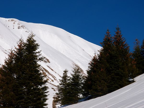Vu les conditions médiocres de la combe ouest du Tabor, j'ai décidé de poursuivre par le circuit de la mer. Malheureusement, celui-ci est tout goulotté et rempli de boules! On peut bien sûr skier sur la petite rive gauche, mais au risque de tout faire partir. J'ai donc choisi l'option face S du Pérollier qui m'a offert 600m de très bon ski! Par contre, j'ai fait partir une petite coulée lors de mon premier virage.