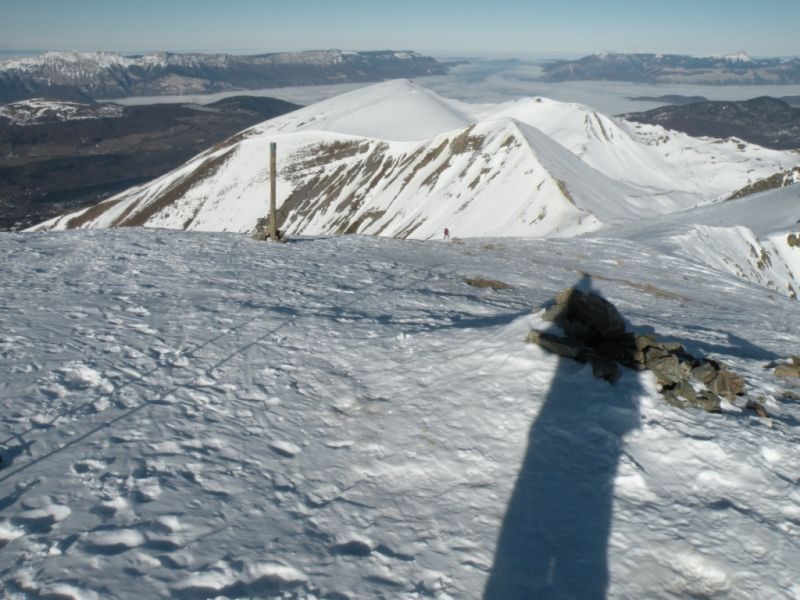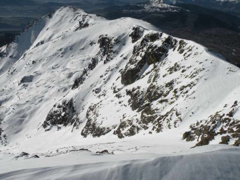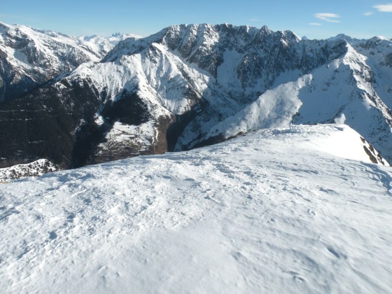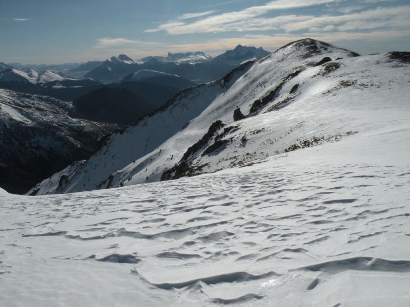 La montée au Tabor est sur tracée... la neige a l'air bien stable, il y a quelques grosses corniches sur l'arête entre le Tabor et le Banc.
