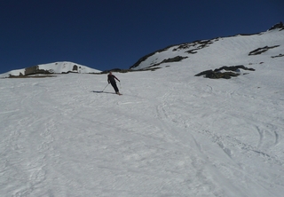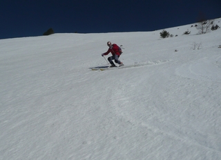 Neige transformée de bas en haut. Descente en neige béton de la combe ouest du Tabor (vers 10 h 15mn), moquette idéale pour le versant ouest du piquet de Nantes ( vers 13 h)