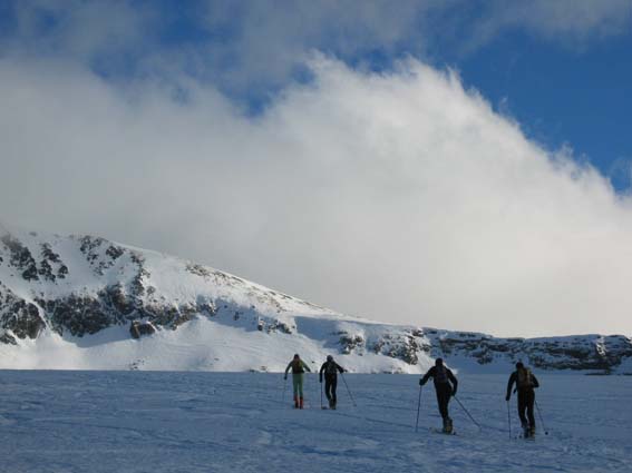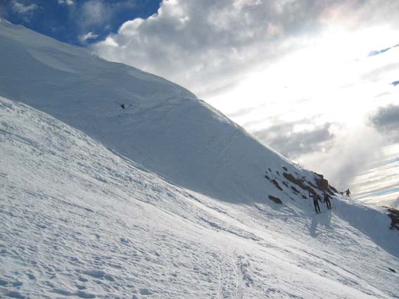 Le Pas de la Mine est problématique car il est en neige froide tassée gelée par endroit. Trois de nous sommes passés droit en crampon sous la corniche sur une neige gelée par endroit (un bon 50) deux autres en traversée exposée à ski. Pour la descente à ski du pas de la mine on est passé 50m en dessous des traces classiques de descente, neige légère à cet endroit mais un peu expo car forte pente et petite barre en dessous.
