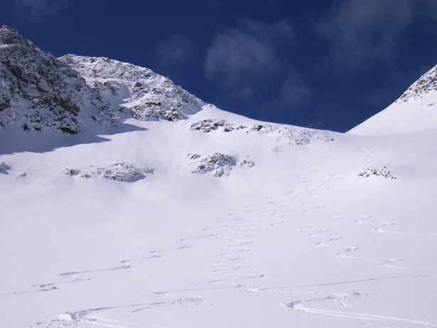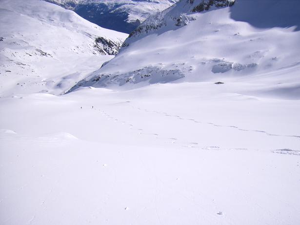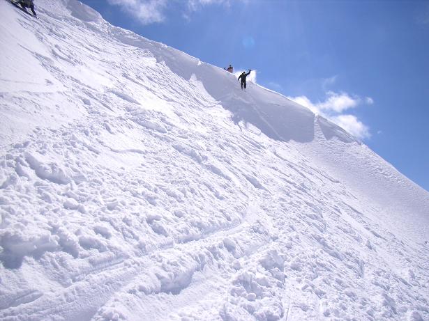 Les randonneurs qui privilégient le ski de printemps sont de sortie, au moins 30 personnes au départ, la neige est dure les techniques s'affrontent: portage avec ou sans crampons, ski avec ou sans couteaux. Malgré tout ce monde, la Face N vierge de trace nous a attendue, belle neige est tranquilité contraste avec la foule du départ.