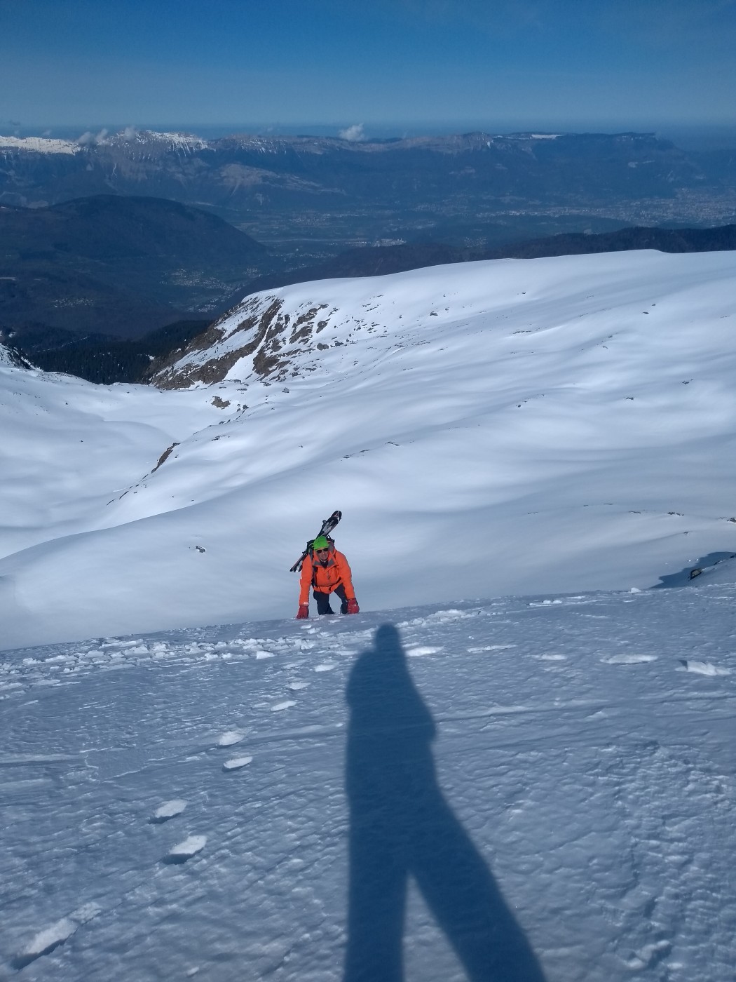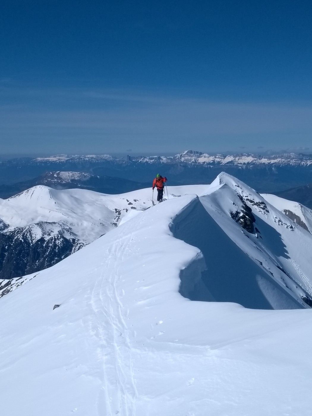 On chausse et déchausse encore à la voiture malgré des bandes de route à éviter sous 1600. (ski sur herbe) Il reste encore pas mal de neige, au moins 1m au Poursollet ! Montée sans couteaux la neige a un bon grip. Le pas de la mine en crampons et l'arête Pinelli à ski. Superbe vue au sommet. Pas vraiment de poudre dans la combe nord, un peu de croute. Le retour par la route est loooonnng, mais ça vaut le coup. Pas beaucoup de monde, ils sont où les randonneurs?