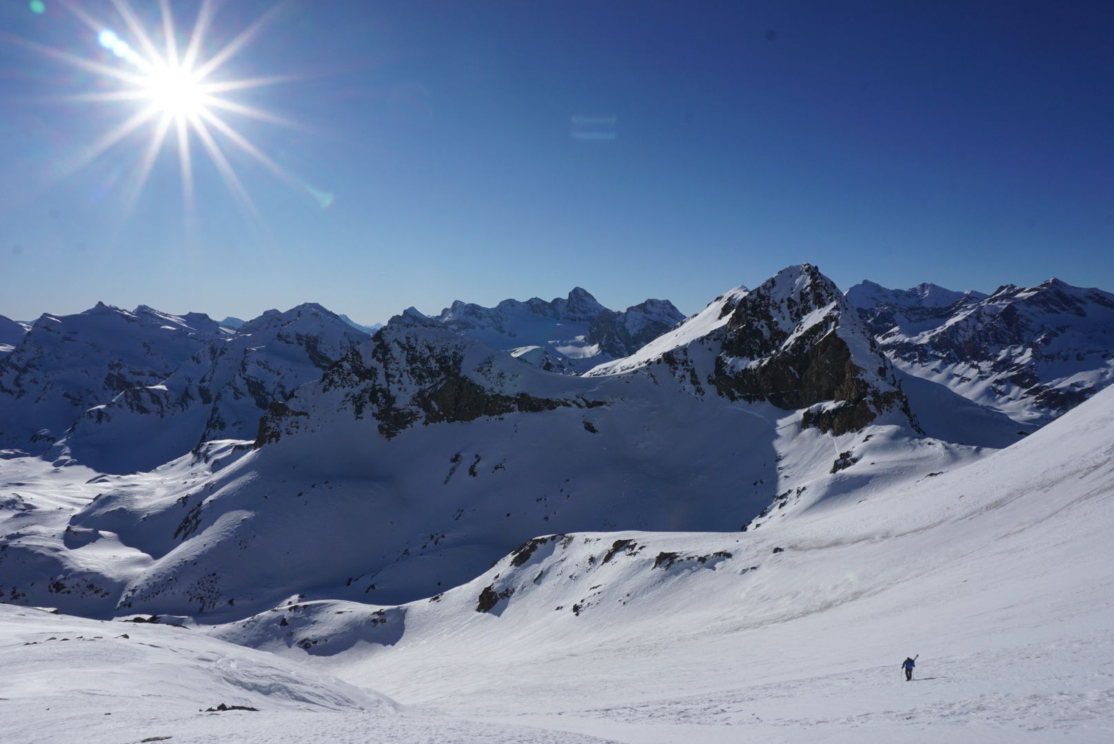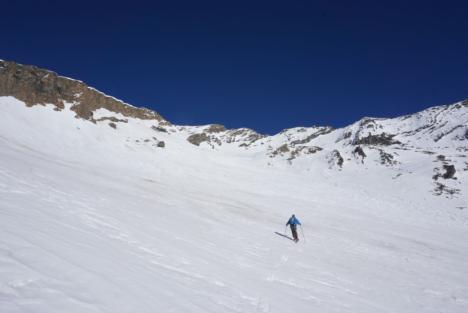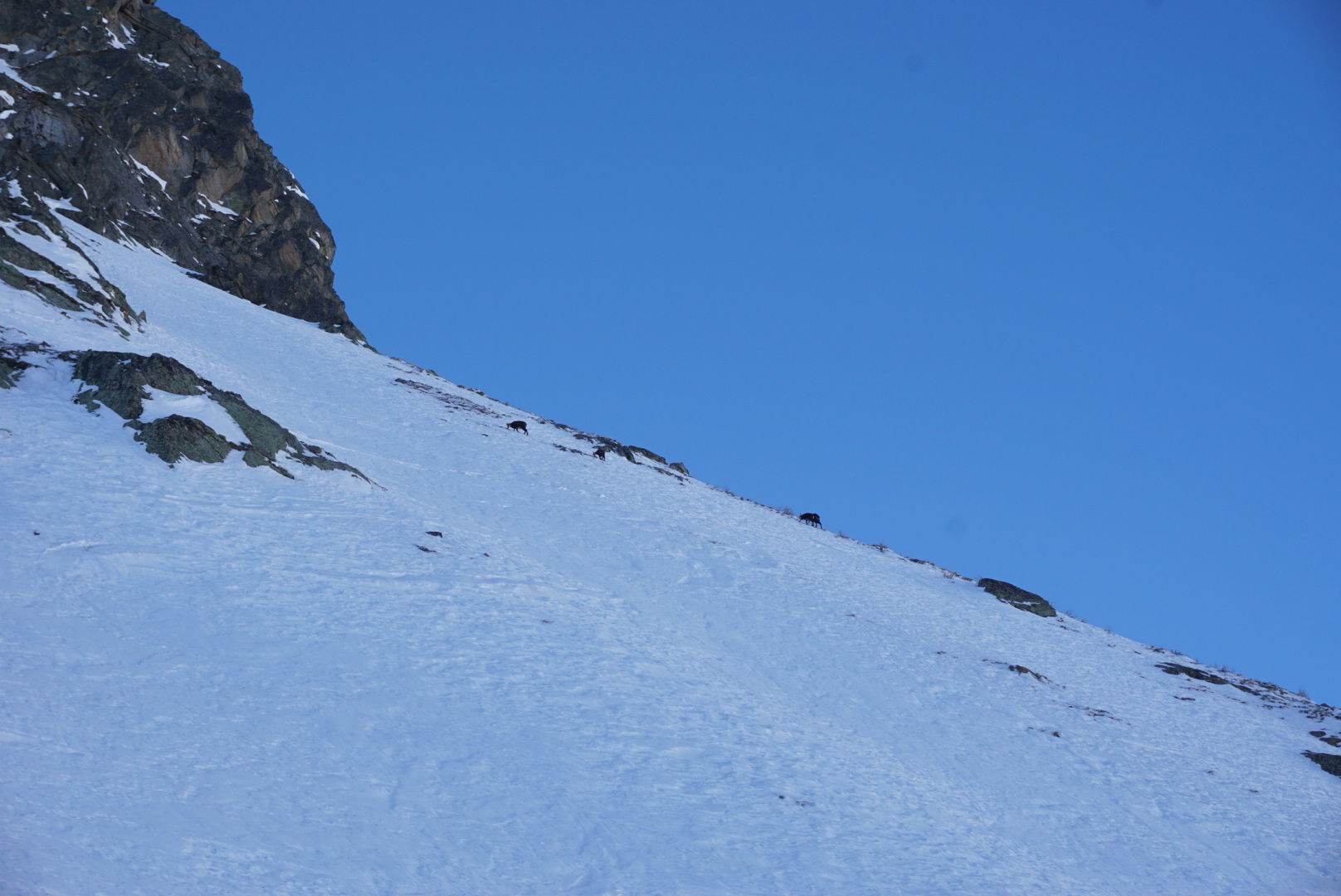 A la découverte de ce coin sauvage - nous n'avons croisé que des chamois, peu farouches dans ce parc national du Grand Paradis. Partis pour faire le sommet du Taou Blanc par le col Leynir, le vent glacial venant de ce col nous a incités à bifurquer à droite dans la grande combe sous le sommet. Au soleil et à l'abri du vent, nous étions bien ! Arrivés au col, nous pensions traverser pour rejoindre la rampe NE de l'épaule 3363. De loin, la rampe semblait avoir été bien affectée par le vent. Nous avons donc préféré redescendre par l'itinéraire de montée. Descente de chaussettes assurée jusqu'à l'alpage du Nivolet ! Couteaux utiles, voire crampons.