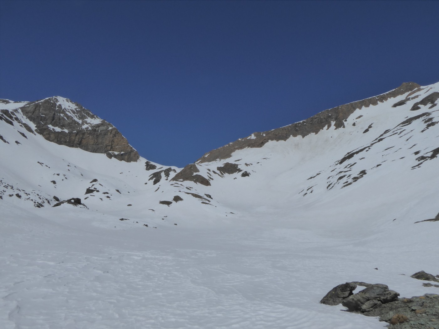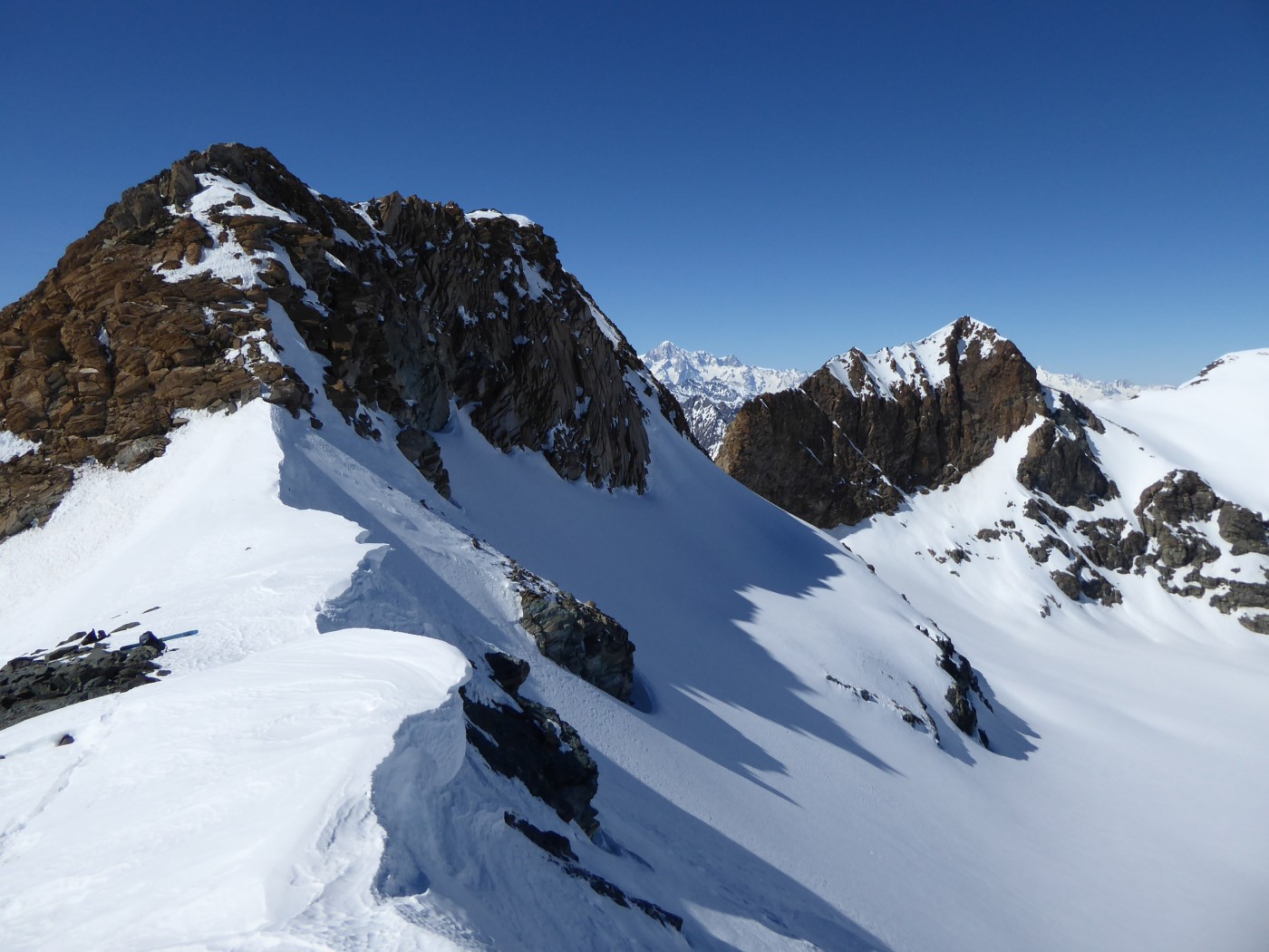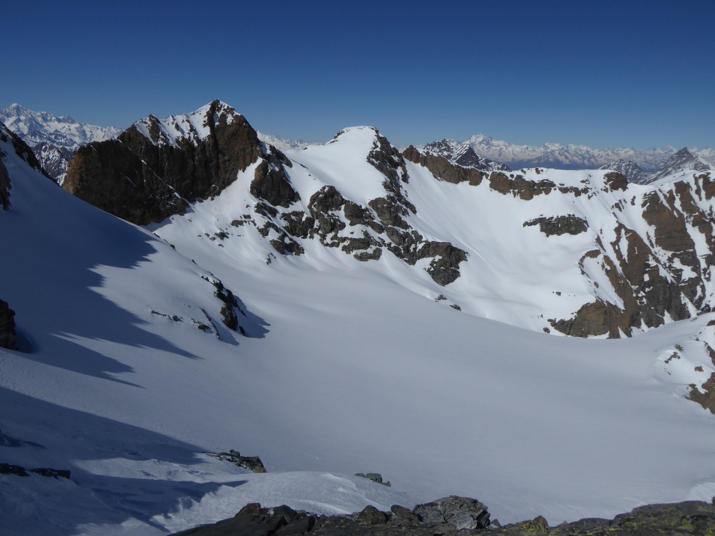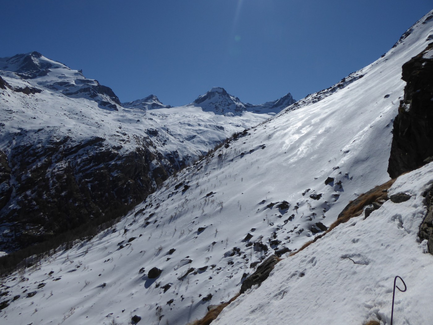 Premier portage de la saison sur D+300m. A la descente, je suis descendu par les pentes nord sous la pointe de la Roley comme décrit dans D5 ce qui m'a permis de skier jusqu'à 2050m env. Belle boucle, dommage qu'il faille déjà porter. L'année dernière, le 19 avril, j'étais venu dans ce secteur pour faire la photo de couverture du topo. Il y avait beaucoup plus de neige et nous étions partis de Breuil skis aux pieds. Pas vu un skieur de la journée par contre beaucoup de chamois comme souvent.