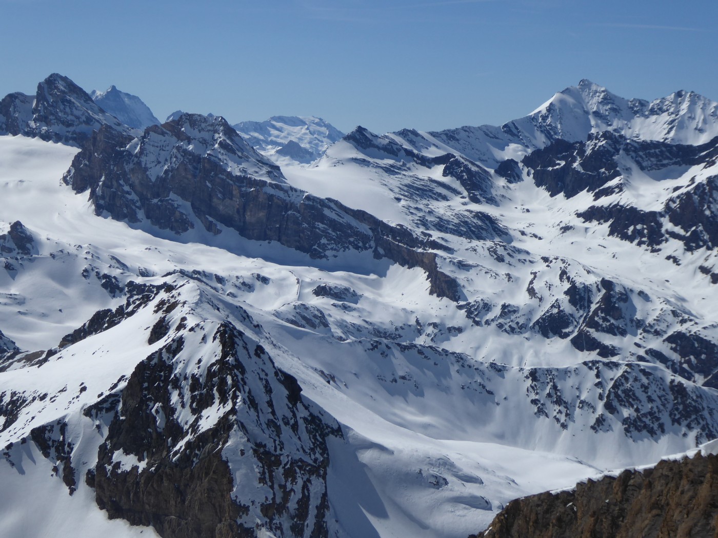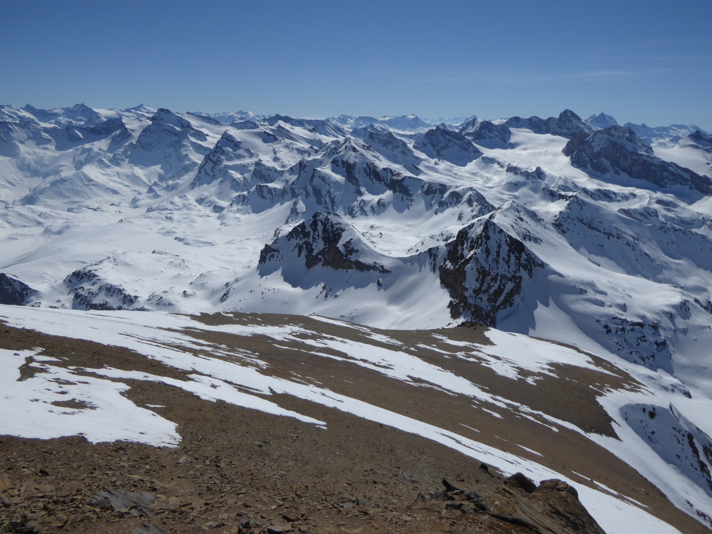 Montée par D6.2 jusqu'à l'épaule 3392 puis sommet par l'arête SSE (mixte facile). Descente par D5.