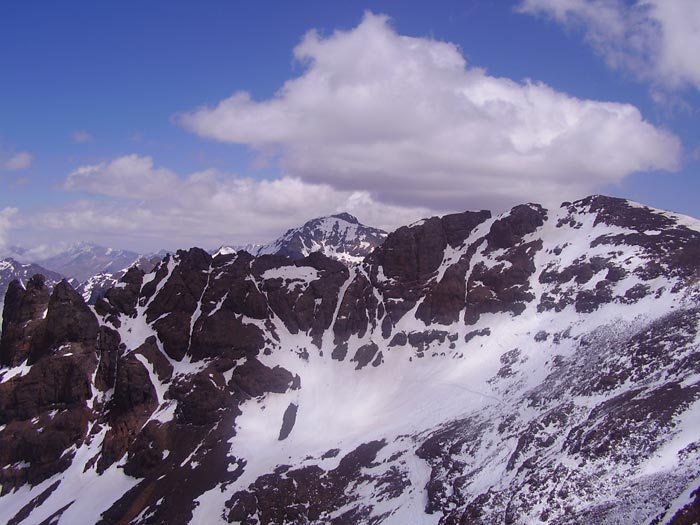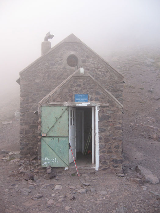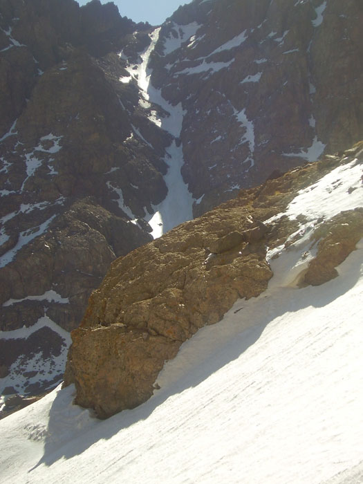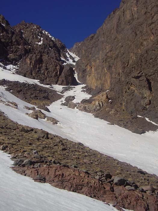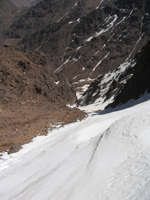Montée la veille en 4 h au départ d'Imlil (massif du Toubkal, haut-Atlas) avec l'aide d'un muletier et de sa mule qui a franchi les cascades d'Iroulhidène pour me laisser au premier névé 150 m sous le refuge. Celui-ci n'était gardé que par un jeune, Brahim, qui n'était monté qu'au cas où, en remplacement du vrai gardien. Conséquence, pas de monnaie à rendre pour le paiement de la nuitée (42 DH cafiste) ni repas. Heureusement, j'avais prévu le coup. Le couloir était assez médiocre, non homogène, avec une couche de cristal cassant parfois 10 cm au-dessus du manteau. Beaucoup de cailloux, le meilleur ski est en bas sous le couloir. Deux interruptions et plusieurs passages de moins de 2 m de large. Photos dans quelques jours