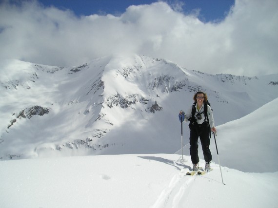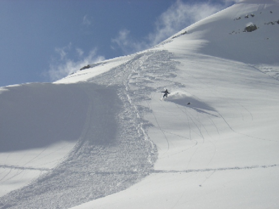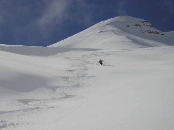A6.1 classique. Changement du programme prévu (traversée de pied brun) en raison des conditions nivos, d'horaire et de fatigue: trace à faire dans 30 de poudre avec bottage, approche longue (2h), vallon interminable et soleil cognant fort. On reviendra en transfo!