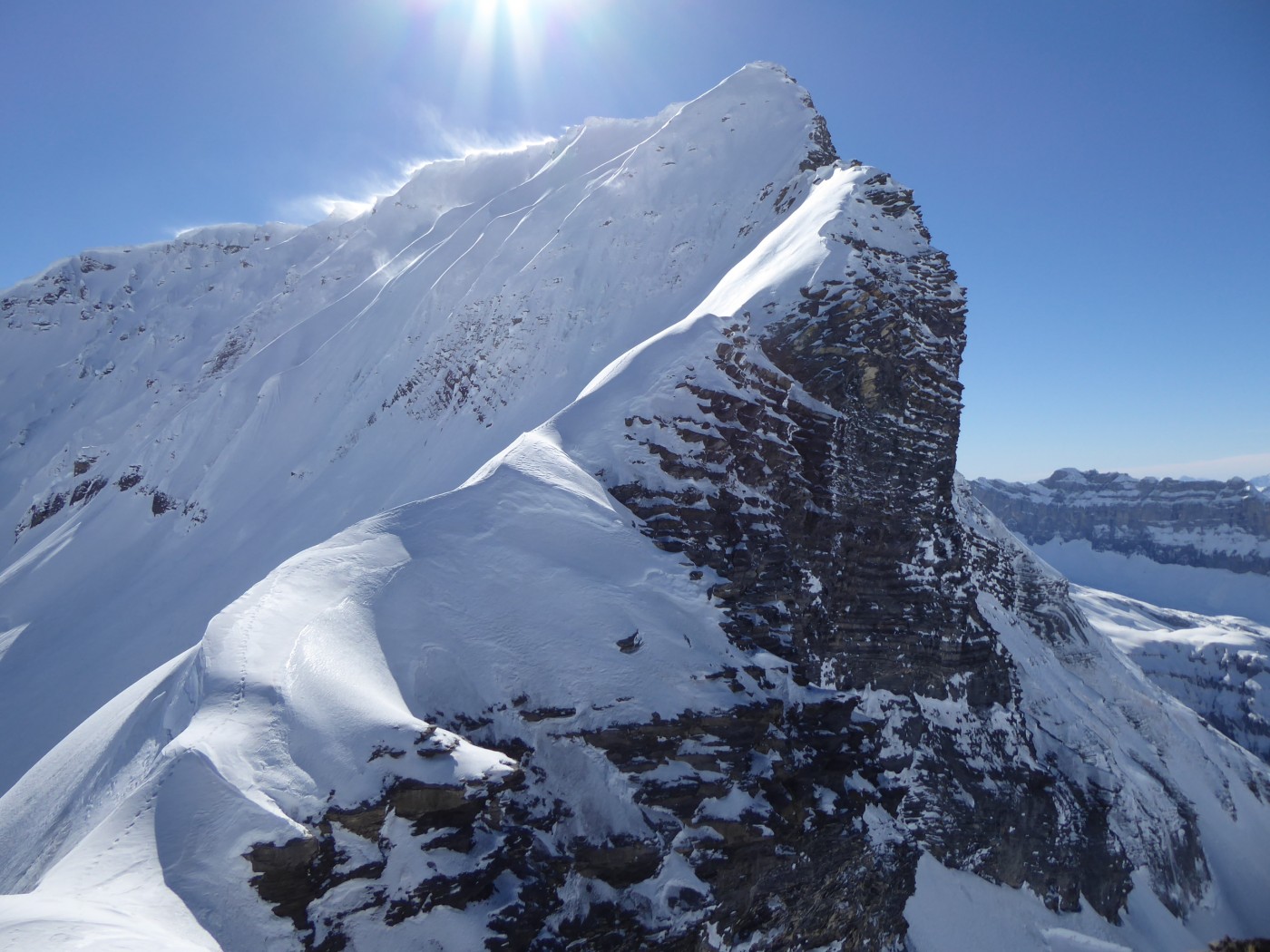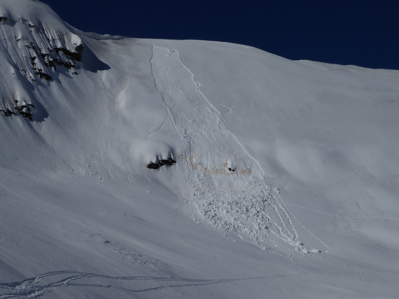 Neige transformée dans les orientations sud mais il ne faut pas descendre trop tard, les dernières chutes de neige n'adhèrent pas bien sur la couche "sablée" par le foehn d'il y a 2 semaines. J'ai déclenché une plaque de neige en cours d'humidification sous la crête de la montagne des Eves qui m'a rattrapée et qui m'a trainé sur quelques mètres avant de s'arrêter. Dans les orientations nord la neige est plus froide mais il y a eu pas mal de transport.
