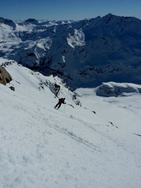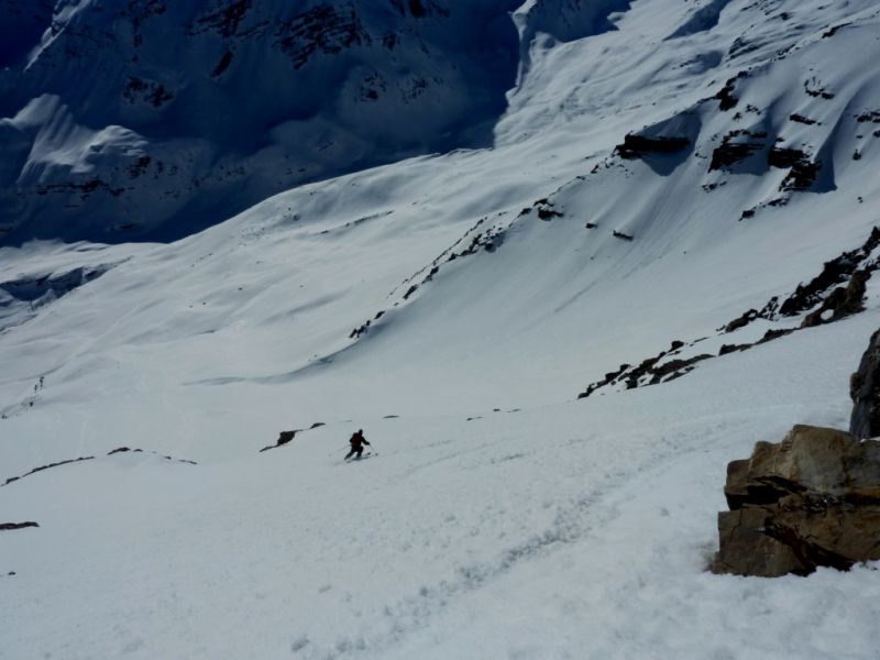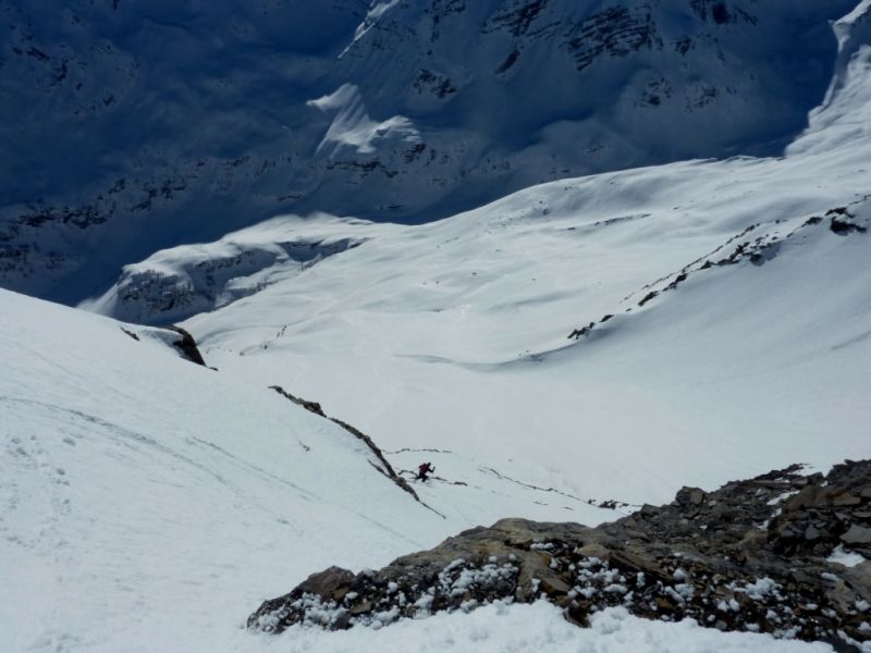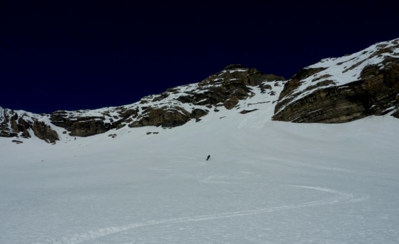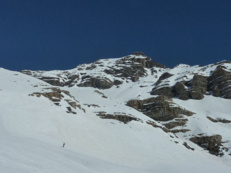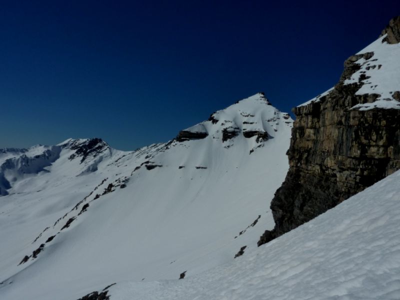 Partis pour la tête de Plumel, un sommet idéal me disais-je pour faire connaissance avec le vallon de Chichin, arrivés à la Chaux Blanche, notre regard est tout de suite attiré par la tête de la Basse. La tête de Plumel, simple hérissement sur la crête neigeuse et qui rôtit sous le soleil n'a pas l'allure de sa voisine, pyramide élancée et légèrement hautaine dont les pentes tournées vers l'est sont bien plus prononcées. Un tour de tête de plus vers la droite et on se retrouve face à celle de Bertrand. Celle-ci, contrairement à la Basse, présente une large face ouest, rocheuse et trapue ; c'est un peu la belle et la bête version tectonique. Mais Loïsyann a vite fait de repérer un itinéraire dans cette dernière.