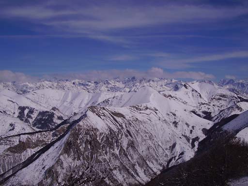 A part les pentes sommitales, toute l?épaisseur de neige date de ces derniers jours, et comme il a fait assez doux, la neige a évolué en grains fins surmontés d?une fine croûte (2-3 cm) en cours de solidification. Donc risques à peu près nuls. Il n?en va pas de même sur le versant nord, que je suis allé explorer, sans oser le descendre en entier. En creusant dans une pente à 25°, je n?ai trouvé le fond qu?à 1,50 m de profondeur. En partant du haut, on trouve une poudreuse extra-souple légèrement humide qui a tendance à évoluer en grains fins qui se solidarisent légèrement (plaques friables), ceci sur deux couches de 40 cm environ. Vers 70-80, une couche plus solide, même assez dure au bâton. On aimerait s?en gaver, mais prudence, il y a du volume?
