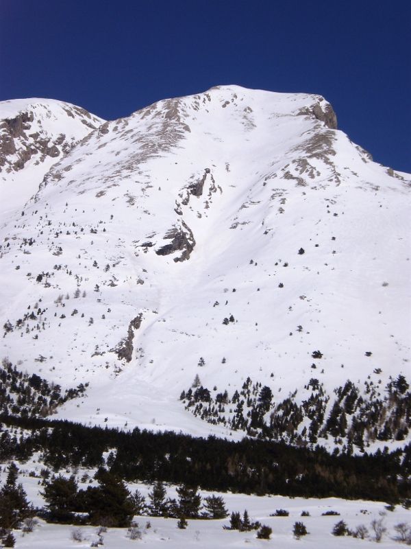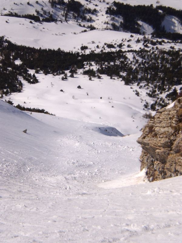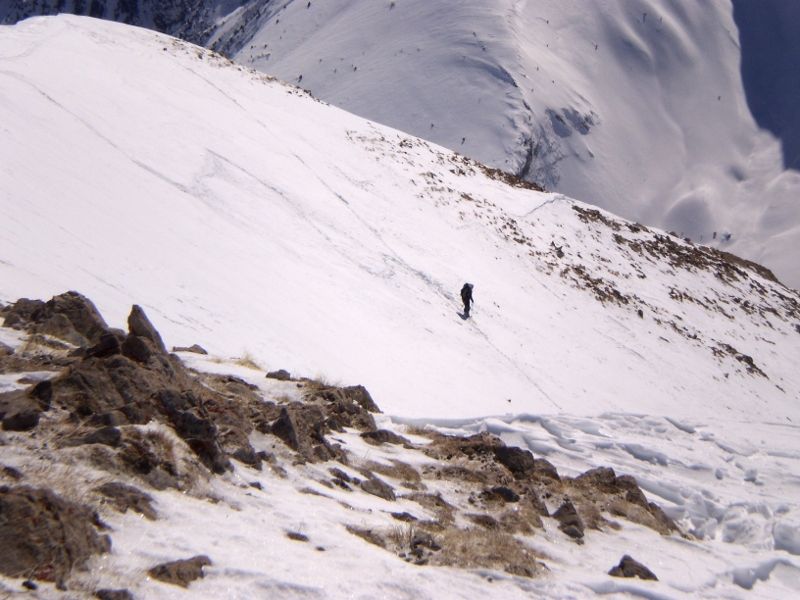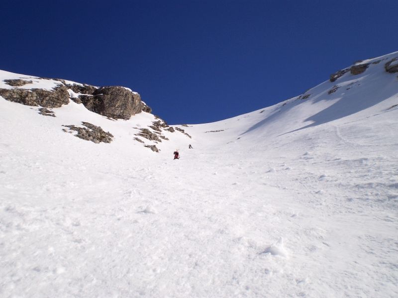 Splendide, nous sommes parvenus au sommet un peu avant midi pour François, midi et quart pour Philippe et moi. François, qui est parti enchaîner avec la combe Chave, est descendu vers midi 20. Nous avons attendu que la neige se bonifie jusque vers 12h45. C'était pile poil la bonne heure, neige encore froide et dure en haut (parfois cassante à gauche) puis bonheur parfait jusqu'en bas : on peut choisir en permanence la meilleure neige, vraiment somptueux.