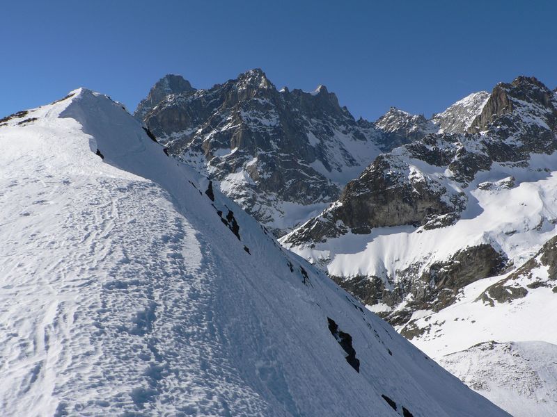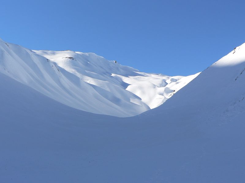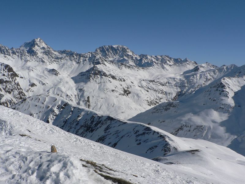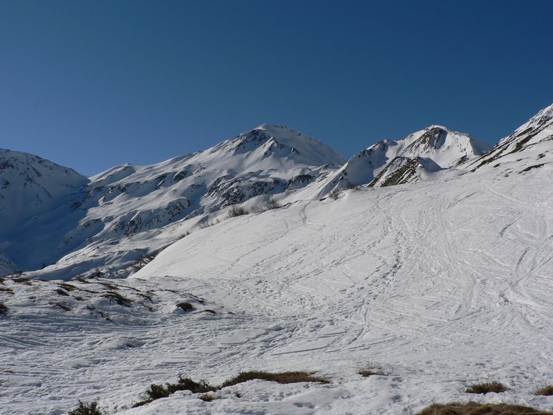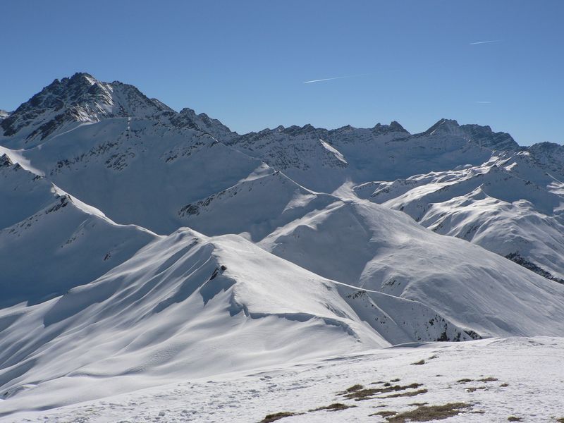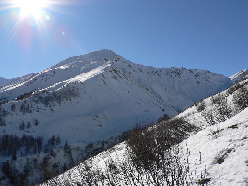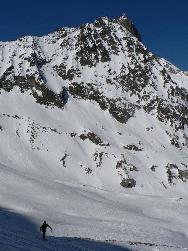 Du Clou, le long des crettés de la Gouille et de la Perche. sommet par l'arête nord. Descente par les pentes sud puis par le torrent de la Peule. Remonter à pied une cinquantaine de mètres pour rejoindre la piste en rive droite de la dranse de Ferret.