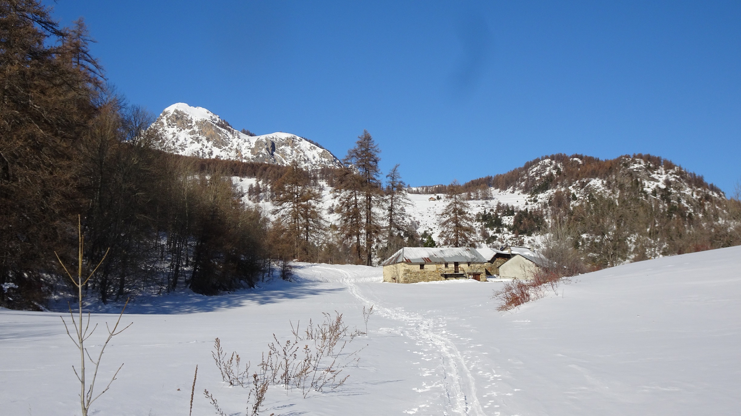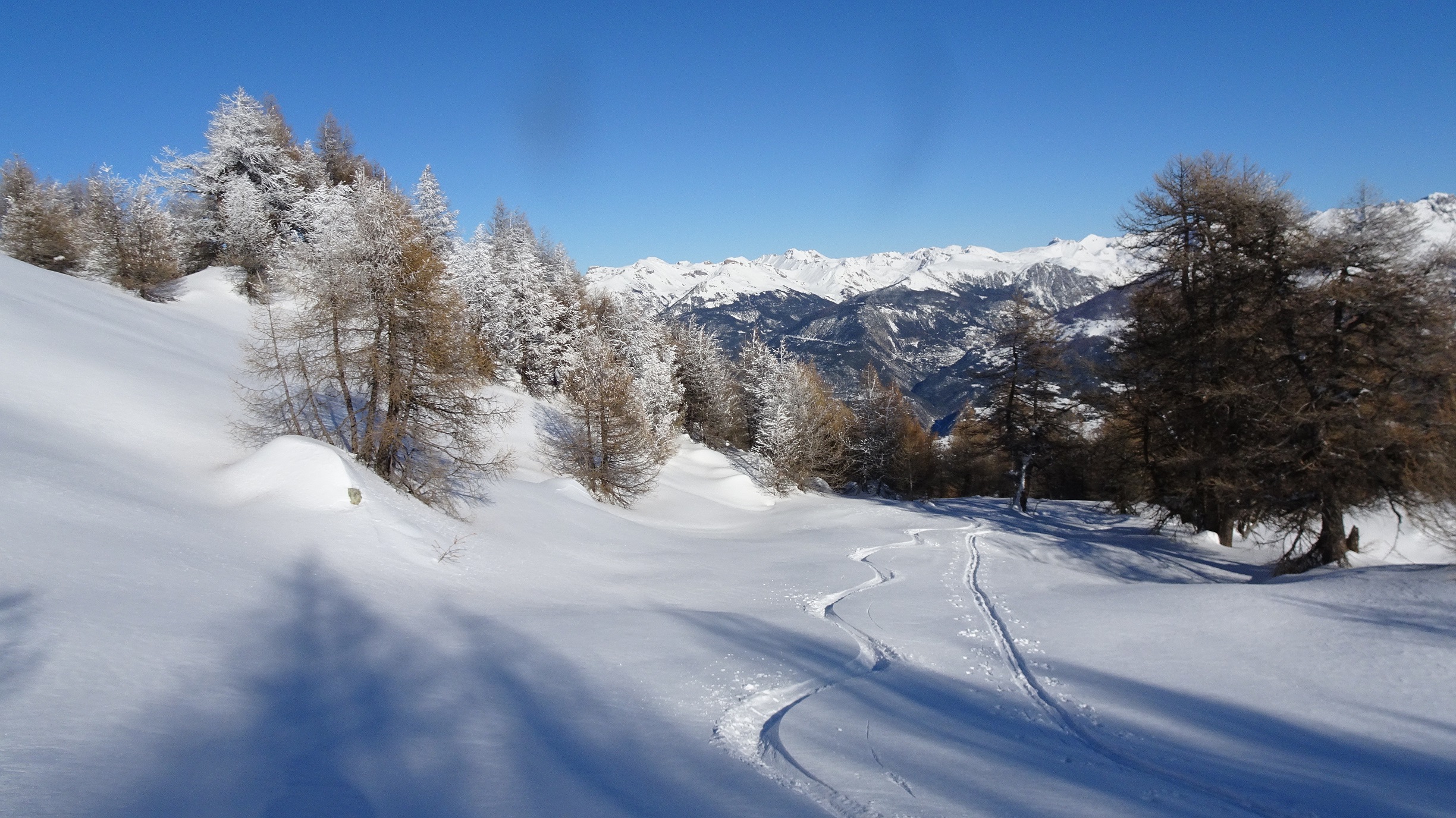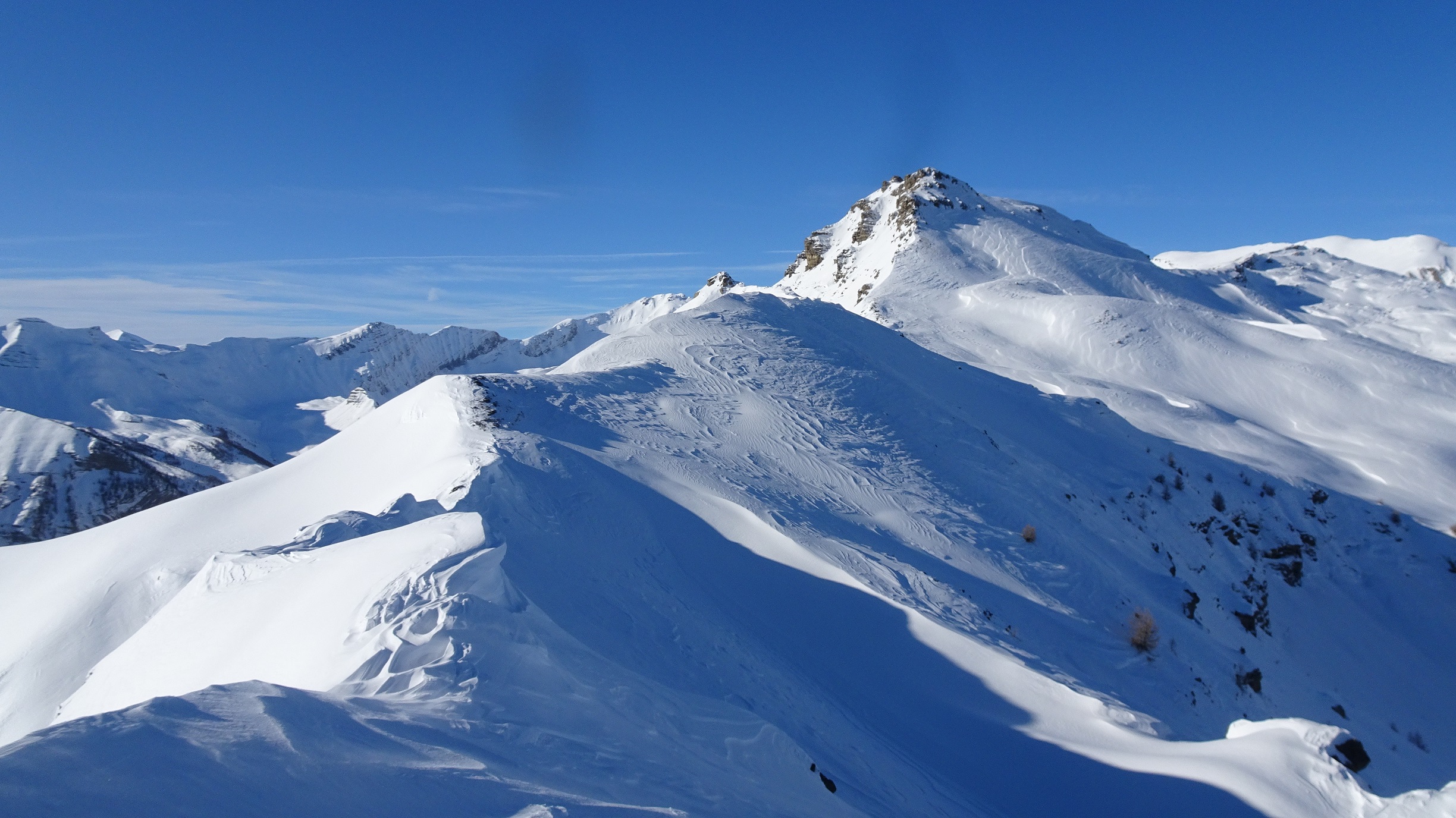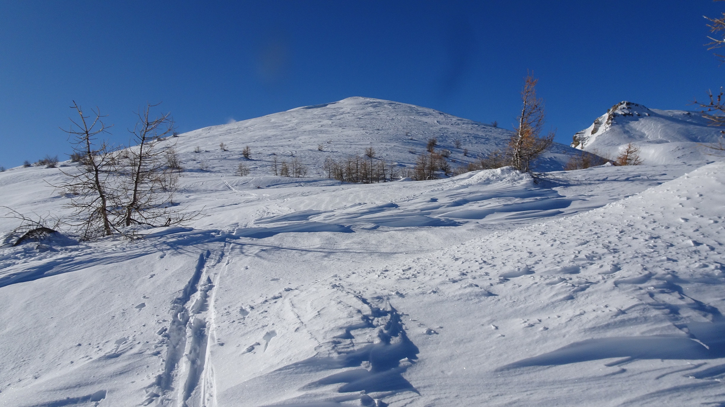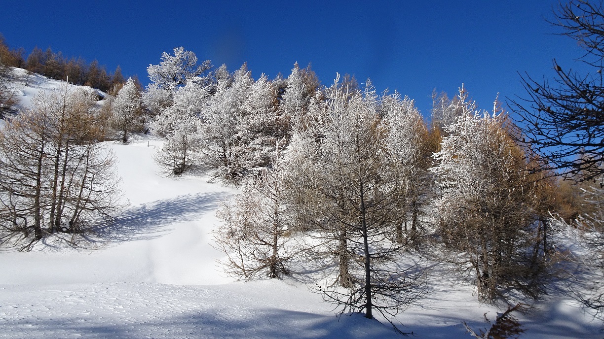 Quelques cm tombés cette nuit sous une couche épaisse restée froide dés qu’on entre dans le mélézin. Skiabilité excellente sur toute la course. Les reliefs nombreux (souches, branches…) sont gommés. A la sortie de la forêt le travail du vent change la donne : neige tôlée mais douce et beaucoup de vagues sur les sommets voisins. Eviter la pente sur le ravin du Clot suspecte