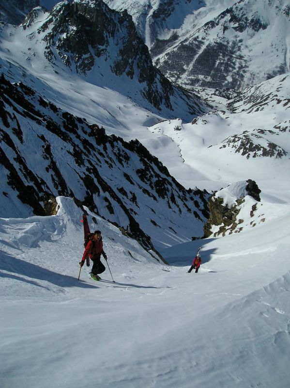 On voulait aller voir ce versant ouest de la Tête de la Cassille. Un peu au jugé on a remonté le couloir qui nous semblait le plus rempli et débouchant au plus près du sommet. En effet, on a atteint la crête sans doute 50 à 80 m sous le sommet. Pour faire passer le temps, AR dans un petit couloir orienté sud de 150 m environ. 350 m environ pour le couloir ouest proprement dit.