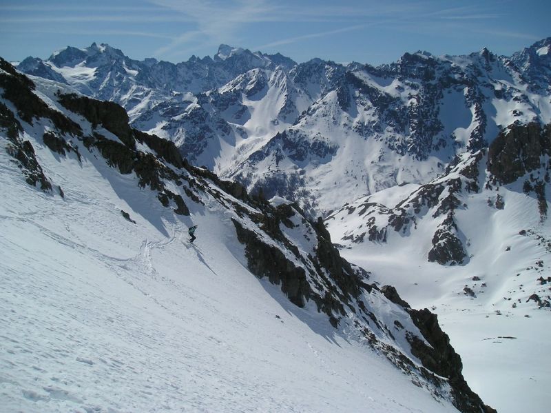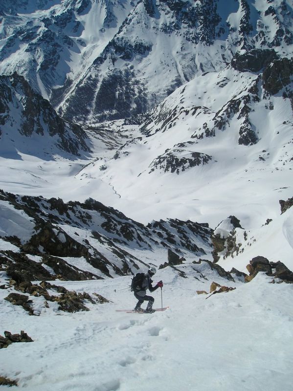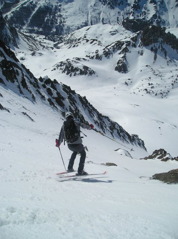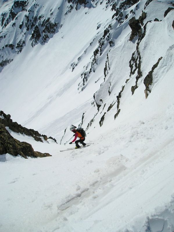 Neige variée dans le couloir ouest néanmoins bien skiante. On a du attendre cependant près de 2 h son décaillage..