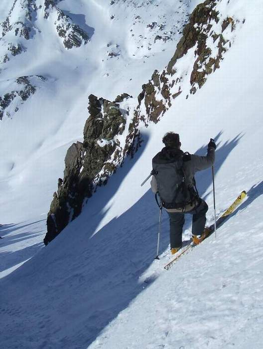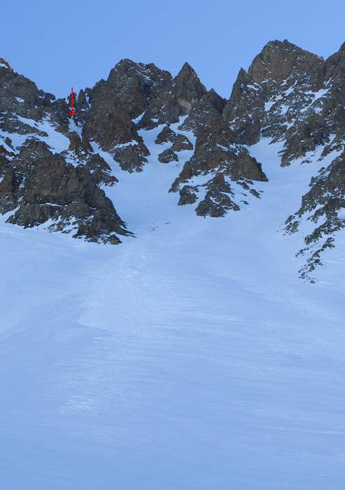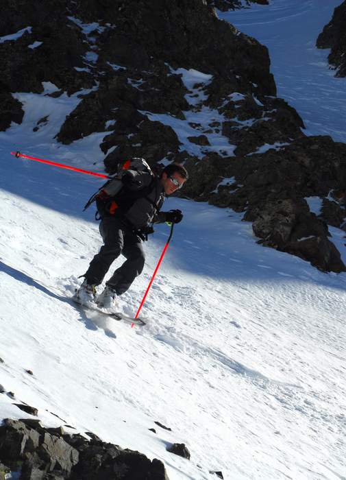 Pas d'objectif précis au départ, un piolet pour trois pris le matin "au cas où"... on se dit qu'on s'arrêtera quand la neige deviendra trop dure. Du coup on choisit ce petit couloir qui ne débouche certes pas mais qui est quand même raide et étroit. Dommage qu'il ne soit pas plus long. On enquille sur le Pic de la Moulinière, la face nord de la Cassille n'étant pas au mieux de sa forme.