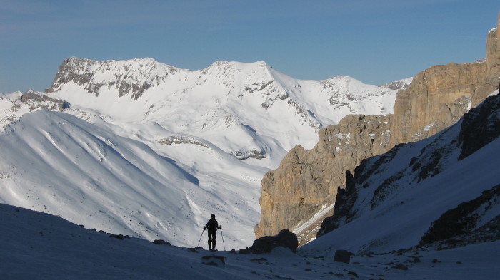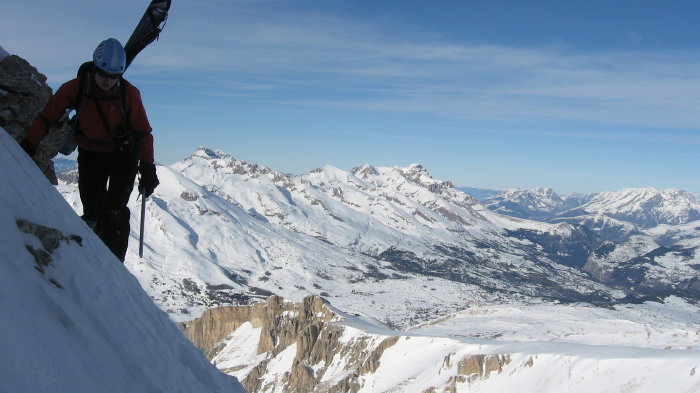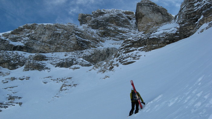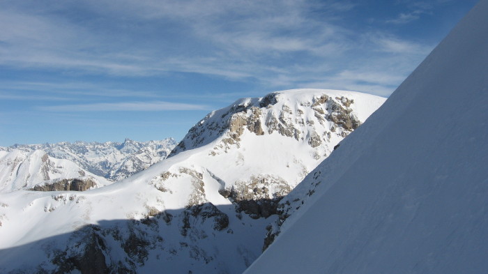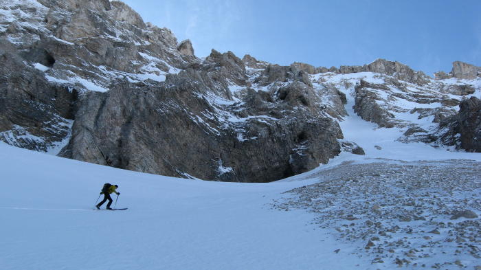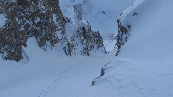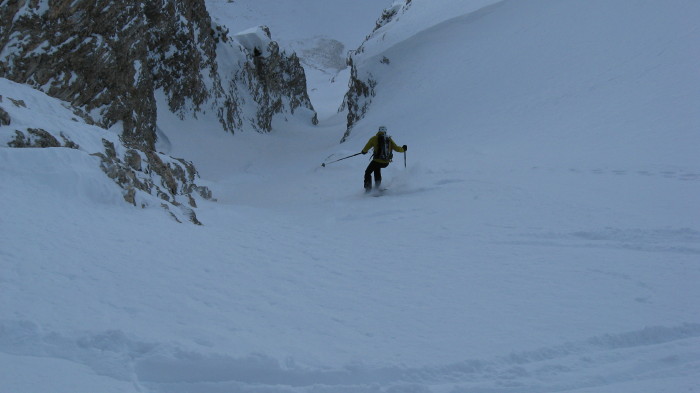 Vallon d'accès un peu soufflé par le vent d'est, laissant des doutes sur la praticabilité de la face. Le pierrier apparait au pied du couloir d'accès, mais celui est très bien rempli: neige type grain fin compact, un peu crouté vers l'étroiture puis plus on monte, plus c'est tendre et poudreux (poudre sans cohésion). Toutefois à la montée nous avons évité la dernière combe à traverser avant le couloir final, plus ouverte au vent, car elle était plaquée (30cm se détachant en blocs sur un fond sans cohésion) en optant pour une sortie directe mixte plus saine. Bon remplissage de la face.