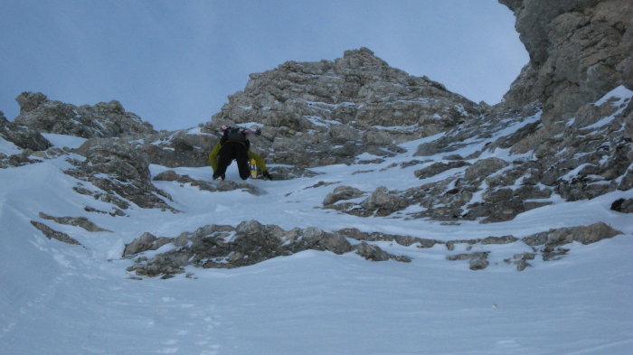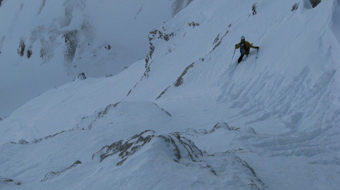 Partis sur une intuition, ce n'était pas gagné d'avance puis ce fut une très bonne surprise de voir la face aussi remplie et avec une telle qualité de neige (on s'attendait plus à de la froide compacte ou cartonné qu'à de la poudre légère). Petite occasion de tester les XP-mountain dans le raide: avec des guêtres pour parfaire l'étanchéité c'est tout bon!