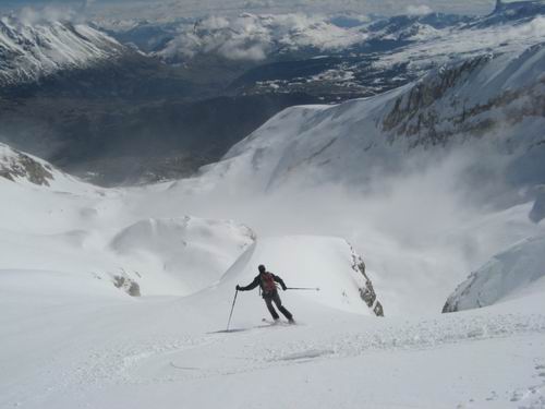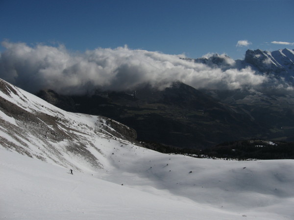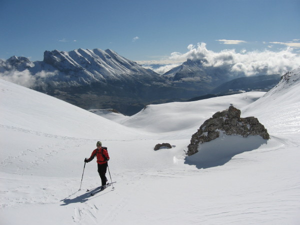 Superbe dévoluy malgré une limite skiable un peu haute. Les rochers sont platrés en N donnant des paysages sompteux avec un beau ciel pur quand il n'est pas encombré par les nuages qui nous ont donné du fil à retordre pour l'assaut de la pente finale et la descente jusque vers 2000=> obligés d'attendre d'éclaircie en éclaircie pour voir l'itinéraire de descente. La solitude était garantie ce jour.