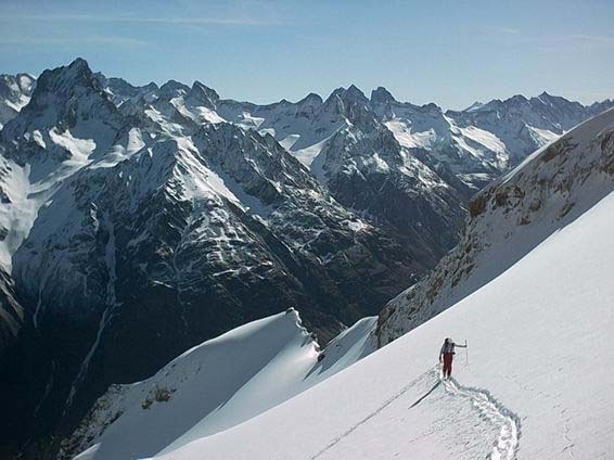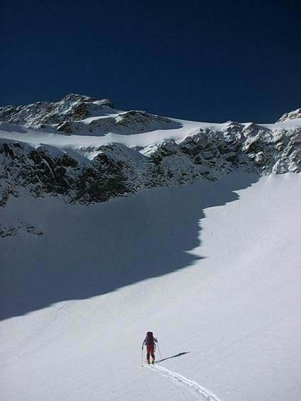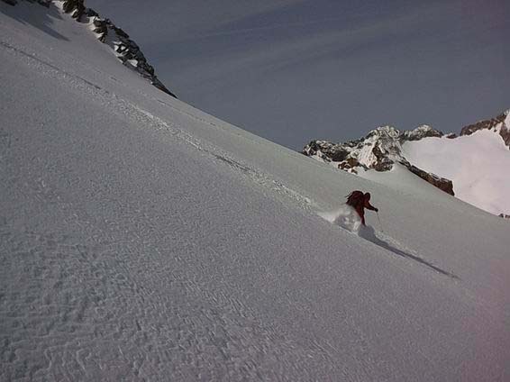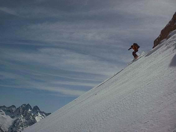 Il n'est pas tombe autant de neige qu'annonce, et elle n'etait pas franchement ventee non plus. Il y a du sable partout sous la couche de fraiche, mais ca ne partait pas specialement sous les skis. Le raide etait peut-etre finalement jouable, a condition de ne pas craindre de brasser : sur le plateau sommital, les peaux ne tenaient pas sur la neige, et a pieds on enfoncait jusqu'aux cuisses. Tres bonne neige a la descente pour la partie haute, apres ca depend des gouts .....