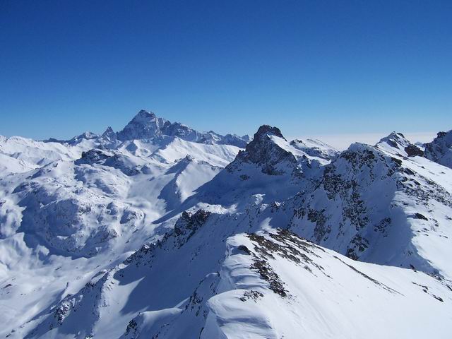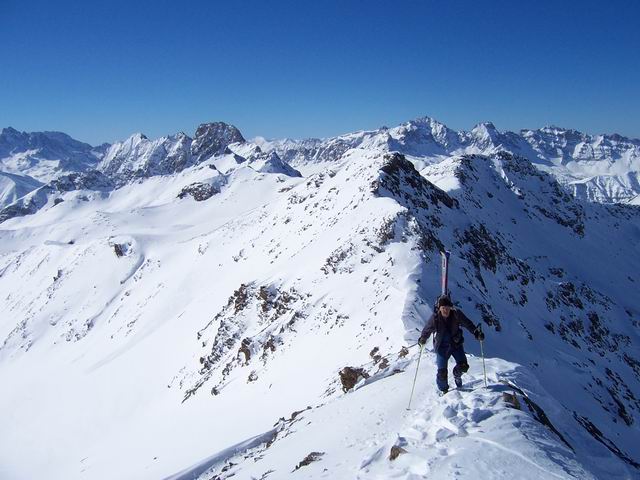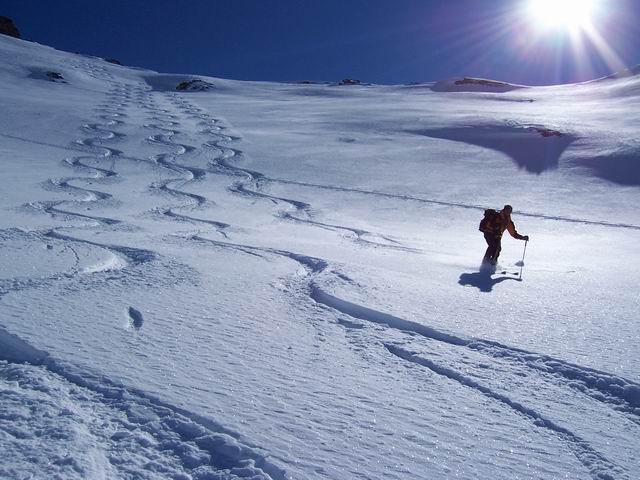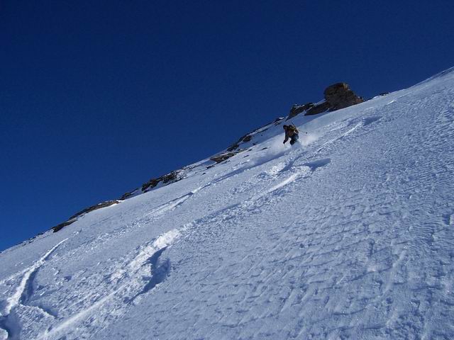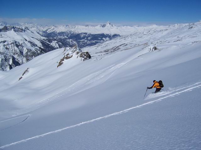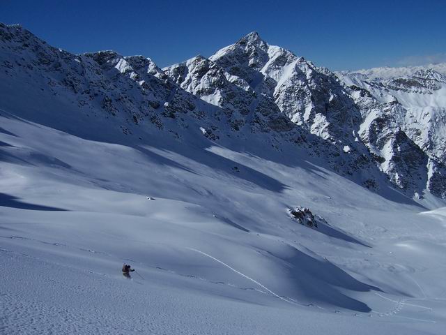 L'objectif du jour était une tentative de sortie directe au couloir N des Avers, mais le piolet oublié, nous avons décidé que c'était l'occasion de cocher enfin cette classique après 5 séjours dans le Queyras pour moi ! Cet itinéraire étant toujours labouré, nous l'avions toujours laissé de coté, mais ce jour nous n'avons pas été déçu car nous avons bénéficié de condtions d'anthologie, avec une seule trace de la veille et pas plus, et le plaisir de 1000m de descente dans une neige de cinéma