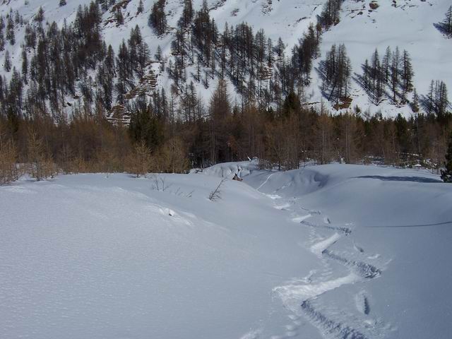 La couche de neige récente est hypra light et repose sur une couche de neige dure avec une bonne cohésion entre les 2. Conditions plutôt rassurantes donc, ce qui n'était pas gagné au vu des champs de mines dans les grandes pentes raides alentour