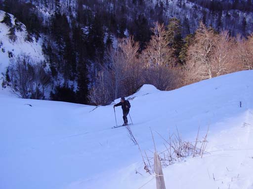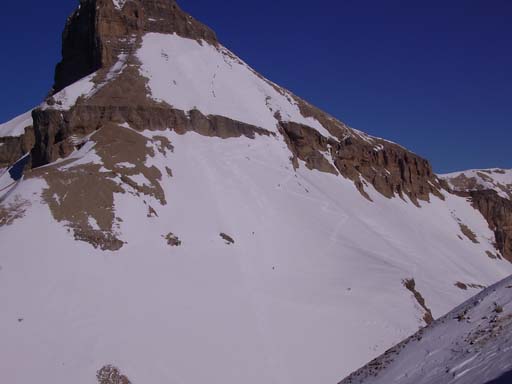 On aurait pu croire à une collective volopress, car dès le point de départ, on pouvait bavarder avec VSH , ANC et CBL, qui sont partis gravir le grand Ferrand, où ils ne se seront pas sentis seuls? (une bonne vingtaine d?ascensionnistes ce jour). Avec Hervé et Nadine, nous avions pensé descendre le couloir sud du Lauzon, mais Hervé, après discussion avec deux skieurs l?ayant tout juste remonté, nous a dissuadés, en raison d?une étroiture en mauvaises conditions (raide, peu de neige, cailloux) et d?une neige dure en haut vers 13 h. Hervé saisit l?occasion pour préciser que la cotation dans son ouvrage " Isère ", concernant ce couloir crédité d?un D-, est manifestement fautive, et qu?il a droit à quelque chose entre D et D+. Il demande à ses lecteurs de l?excuser, et cette erreur sera corrigée dès que possible. Sinon, nous avons été enchantés par la qualité de la descente aujourd?hui.