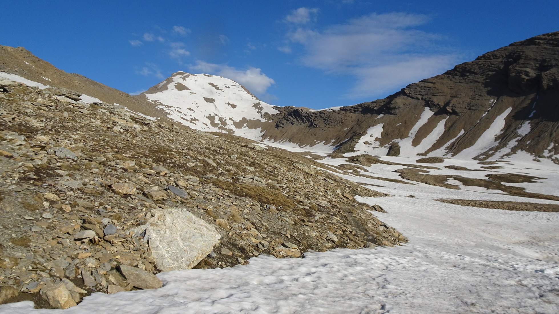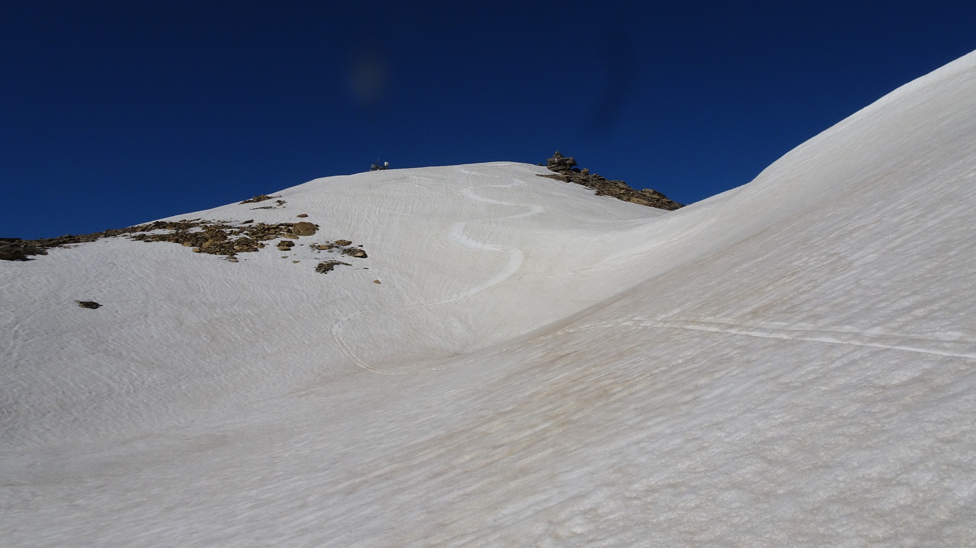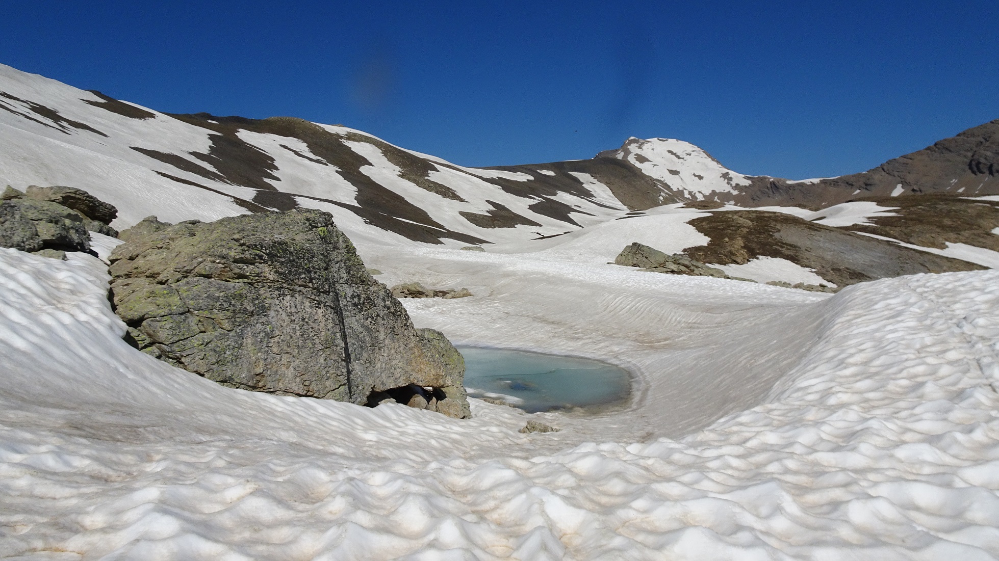 Enneigement en voie de disparition rapide. Névé portant avec le regel nocturne mais partout autour du sol ou des rochers en train de sortir la neige reste pourrie.
