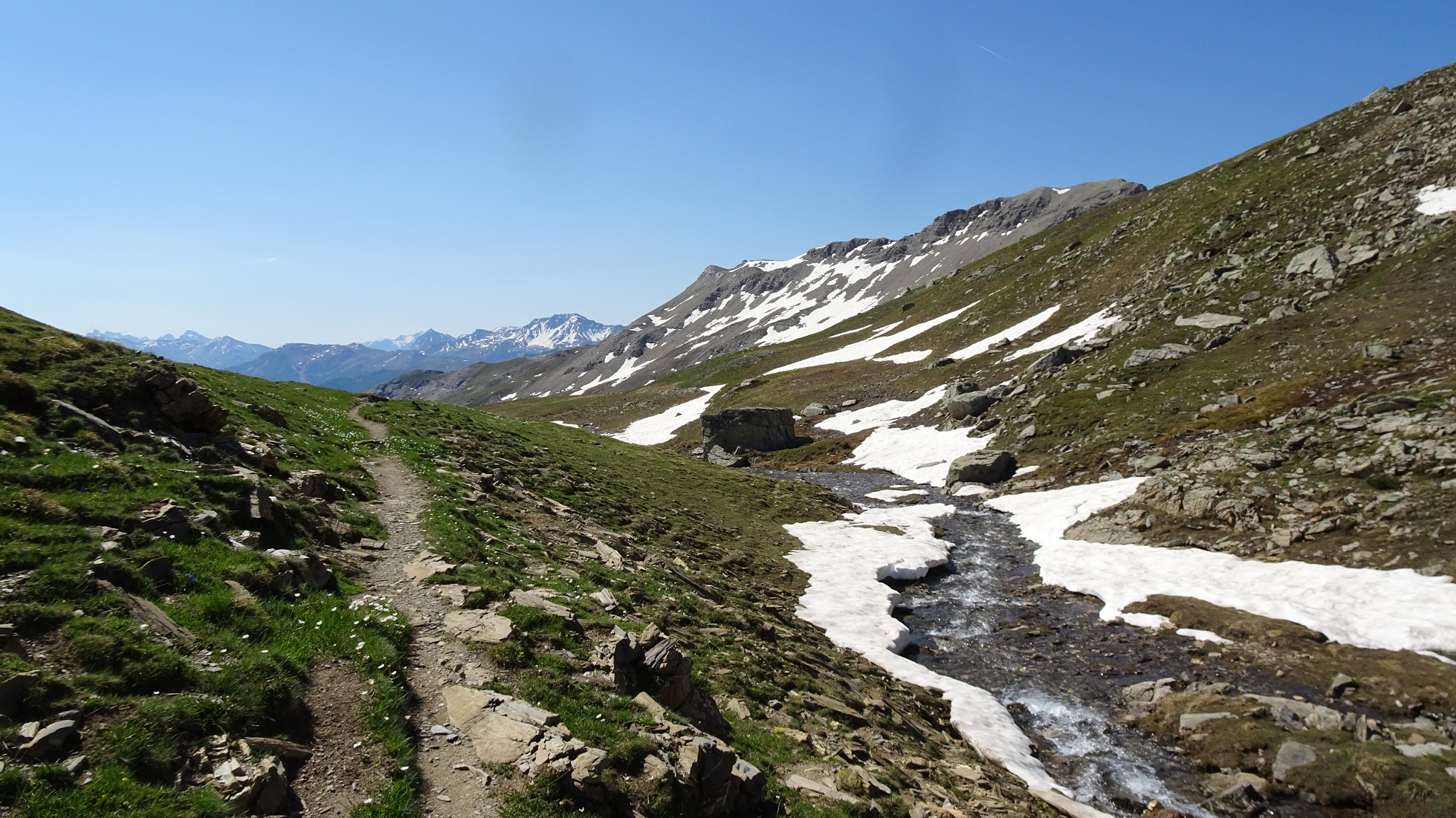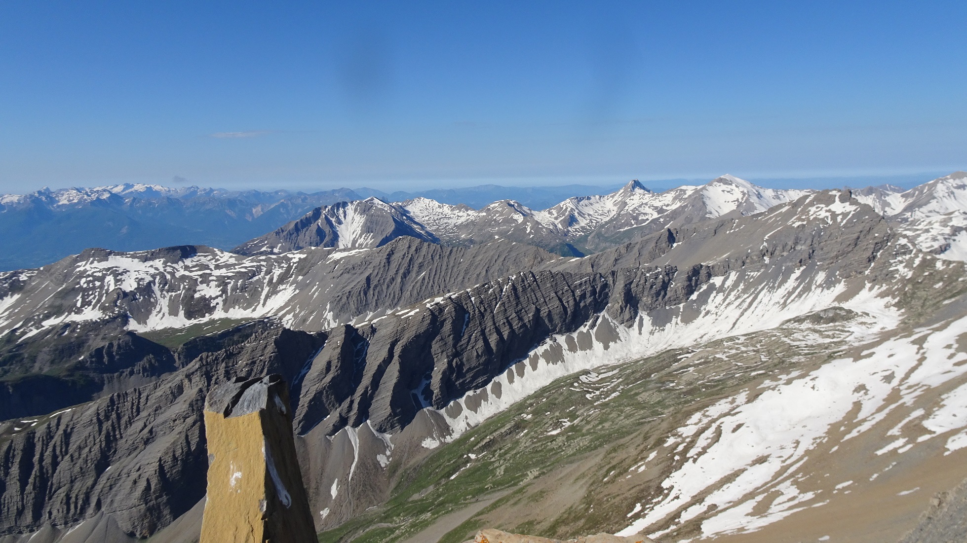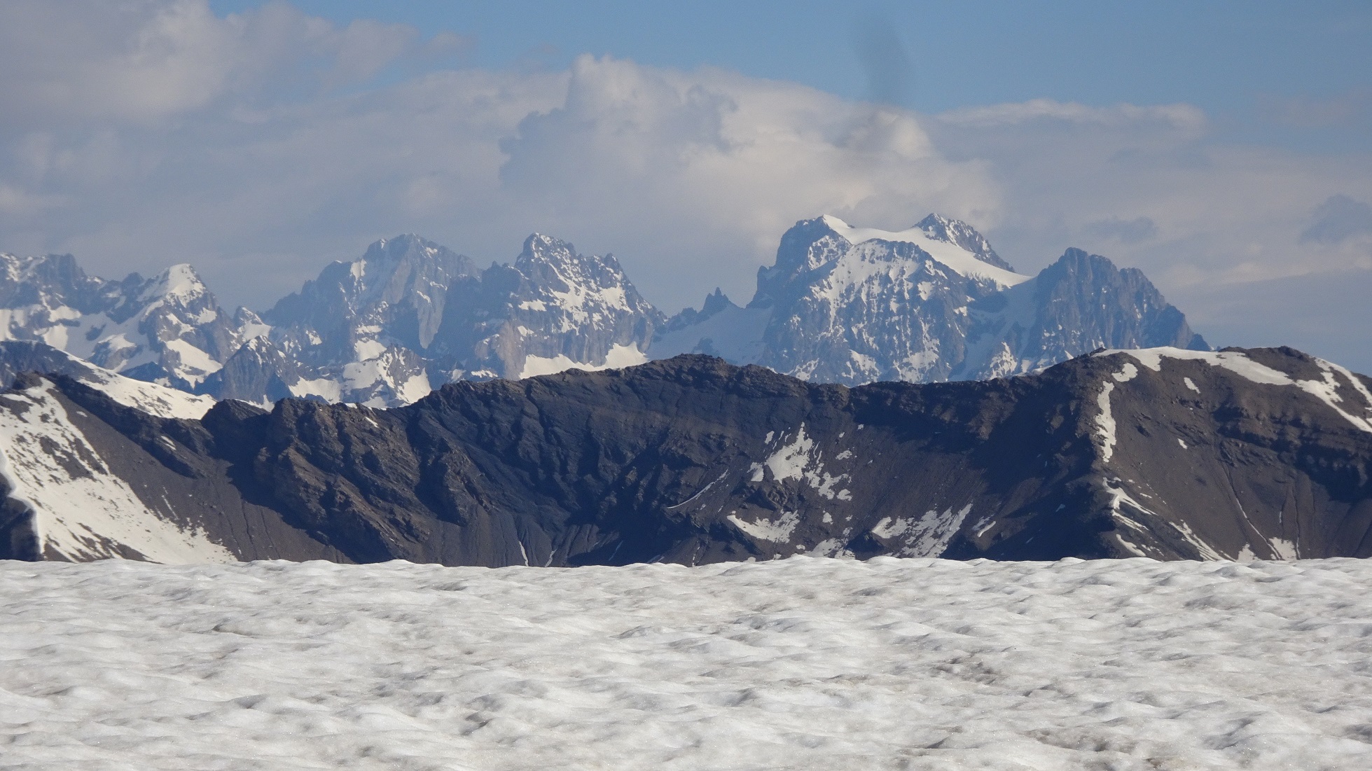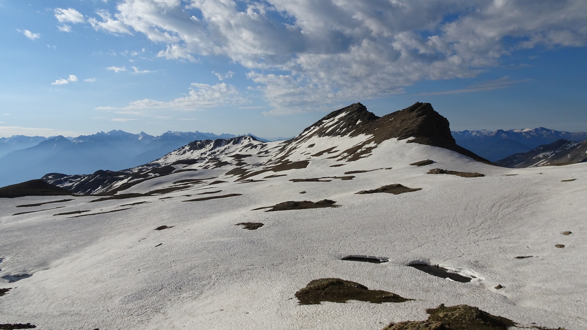 Enneigement en voie de disparition rapide. Névé portant avec le regel nocturne mais partout autour du sol ou des rochers en train de sortir la neige reste pourrie.